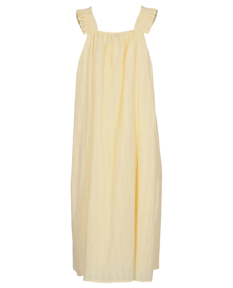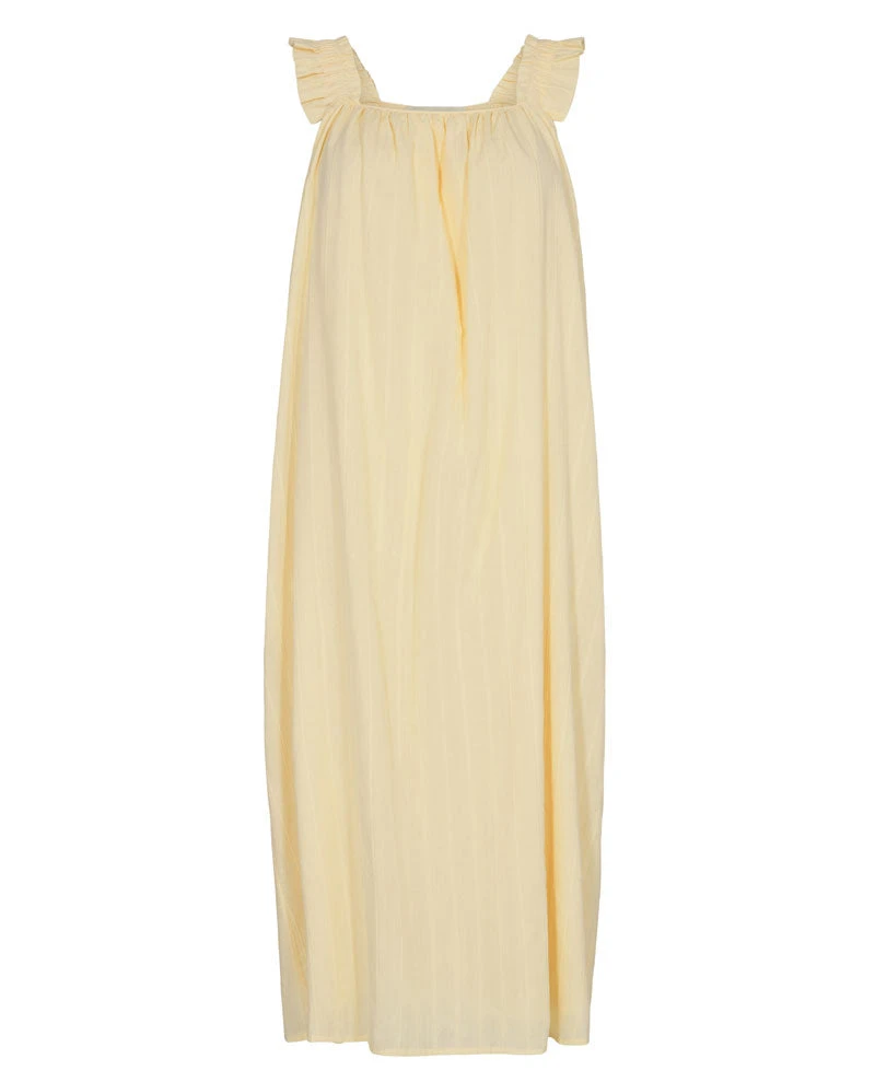 Levete Room Sam Dress, a colourful and floaty sundress in soft yellow tone. With broad frilly straps and subtle vertical stripe detailing.
