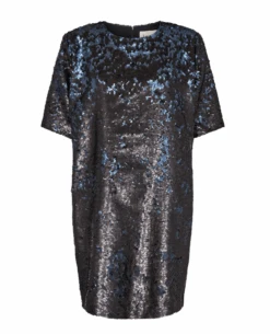 Levete Room Wylie Dress, a loose fit short sleeve dress. With round neckline and loose sleeves, the Wylie dress is complete in black and blue sequin finish – perfect for the party season ahead.