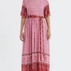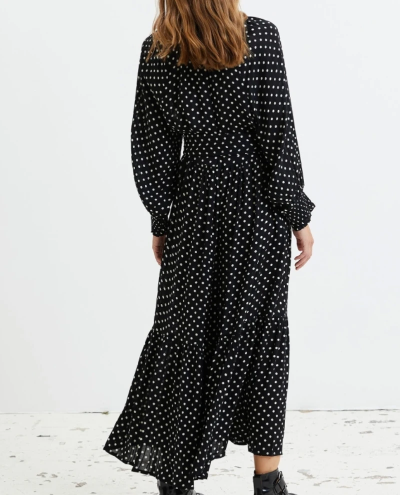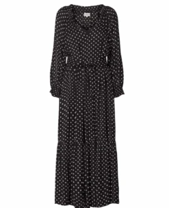 Lollys Laundry Britta Dress, a lovely maxi dress with long sleeves and v-neck. It has a cute detail at collar and elastic at cuffs. Complete with a waist tie to highlight the waist, the Britta is a flattering one which can be dressed up or down.Â