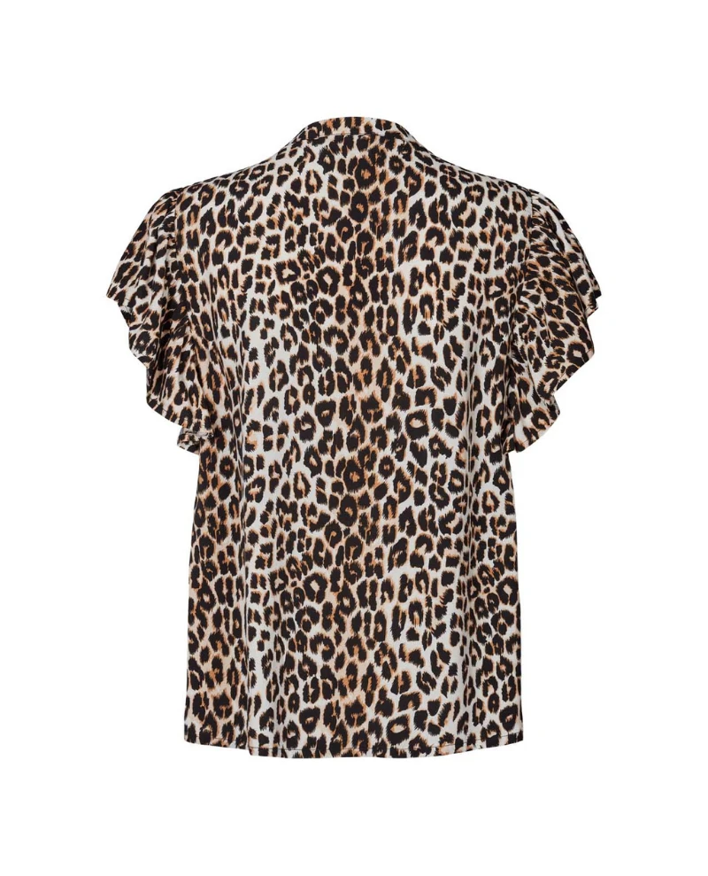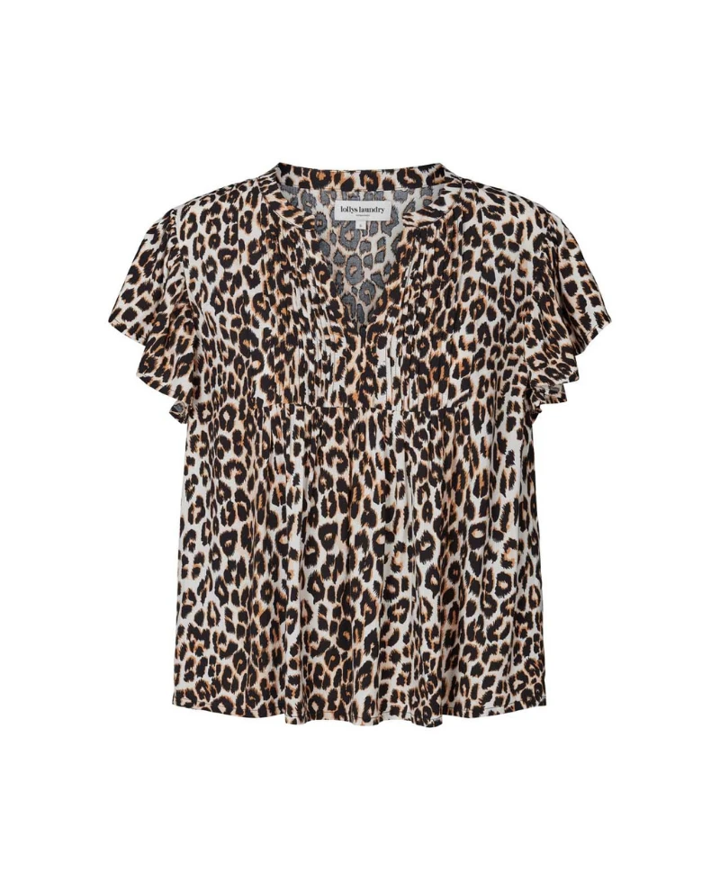 Lollys Laundry Isabel Leopard Print Top, an elegant blouse in repeat print. With a loose fit and short sleeves, the Isabel blouse has arounded neckline with a single button closure to the front which, when left unfastened, creates a v-neckline.