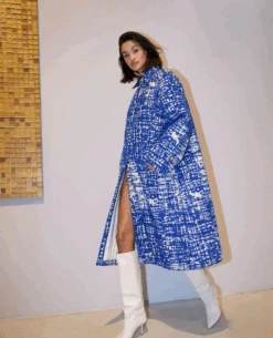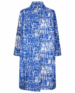 Make a statement with the Mikala Blue Jacket from Lollys Laundry. This long jacket features front button closure, adjustable cuffs, classic collar, and side pockets for a modern, sophisticated look. Crafted with a cotton and acrylic blend, this piece is designed to be worn with a bit of an oversized fit and elegant print of blue and white. Keep cool and look amazing with Lollys Laundry.