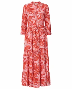 Lollys Laundry Nee Red Dress, a long printed dress in feminine red and pink print. With a simple round neckline and 3/4 length sleeves, the Nee is a bestseller. A floaty, full length skirt and button down front complete the look.
