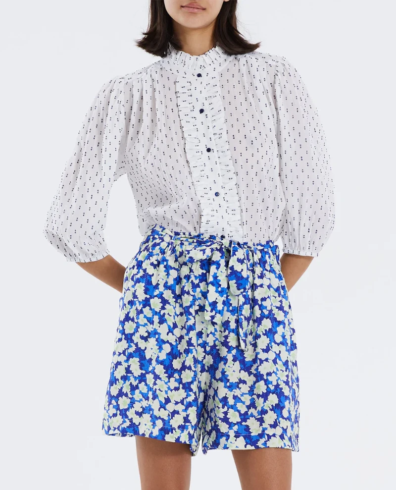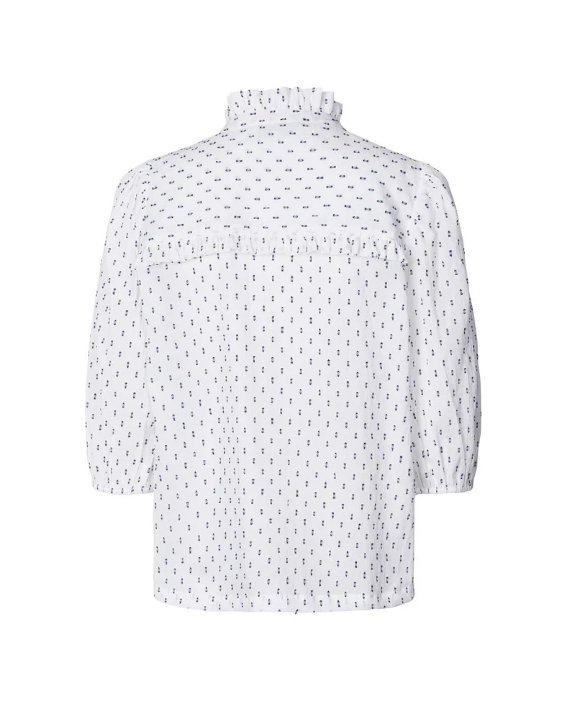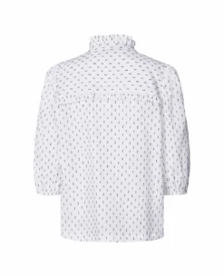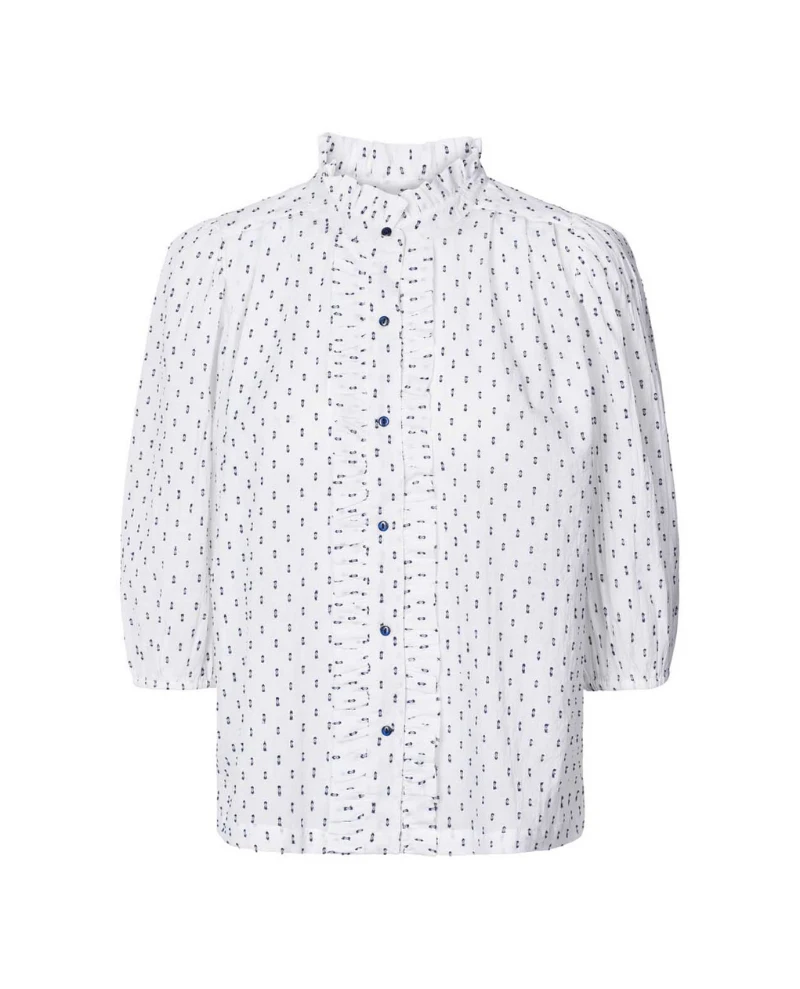 Lollys Laundry Perth White Shirt, a simple but elegant shirt in black and white. With 3/4 length sleeves and a high, frill detail neckline, the Perth Shirt has a button down finish to the front with a regular fit.