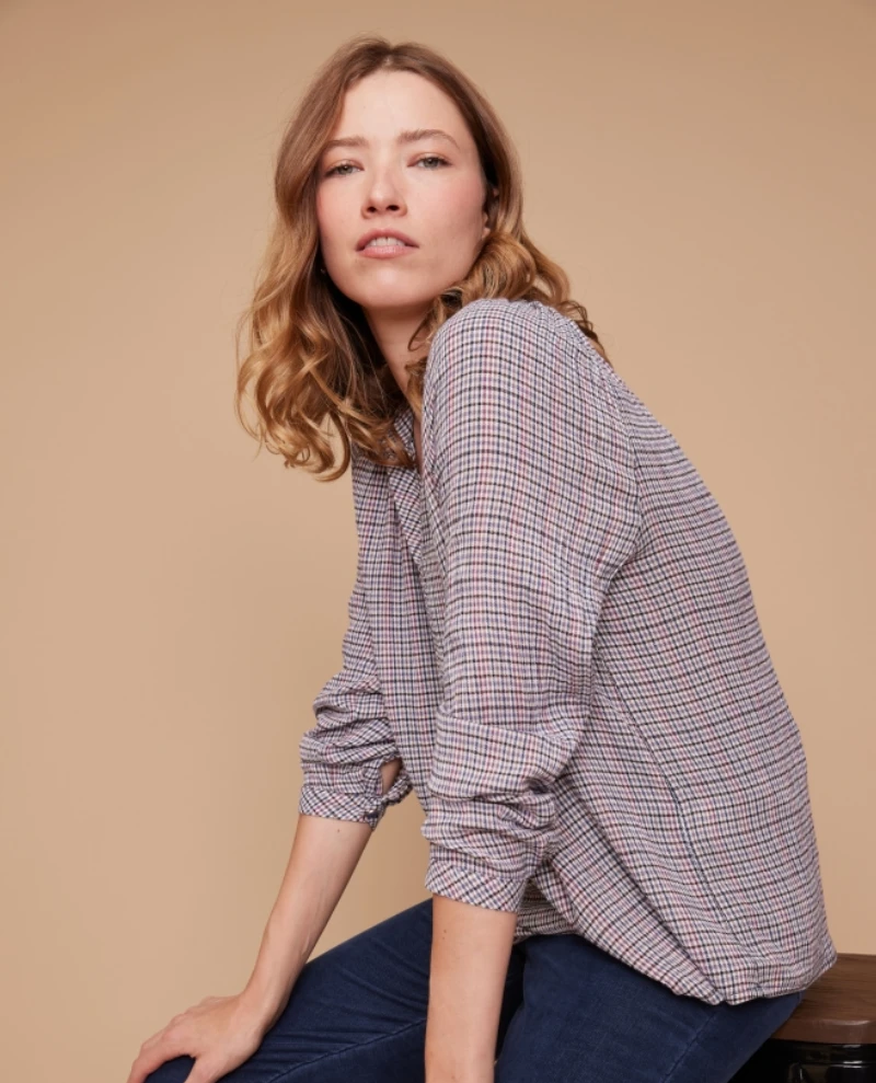 Louizon Linobis Top, a micro check blouse with loose fit. Made from a viscose and wool mix, the Lino blouse has long, loose sleeves with v-neck opening to the front.