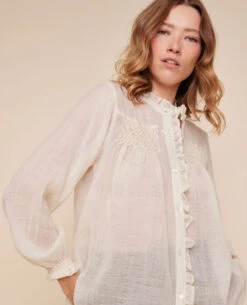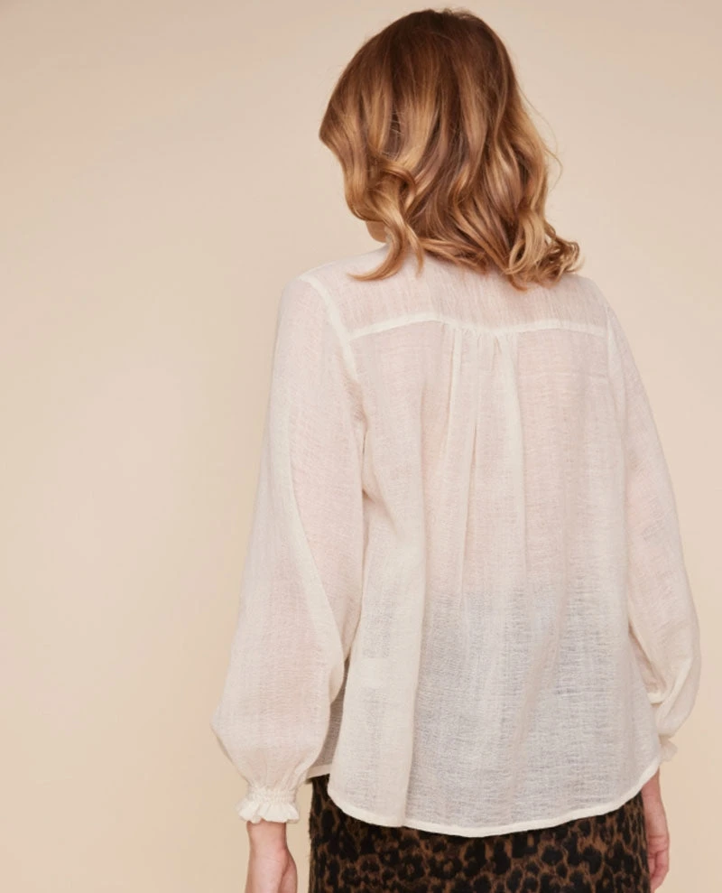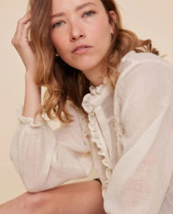 Louizon Vega Top, a beautifully feminine and floaty blouse in soft creamy tone. Woven, the Vega top has a loose fit with ruffle detail to button placket, neckline and cuffs. Complete with decorative ruching to the bodice front.