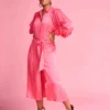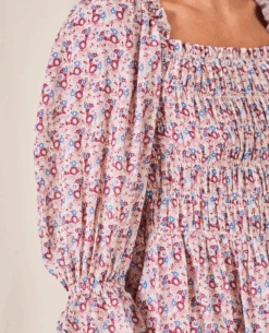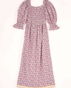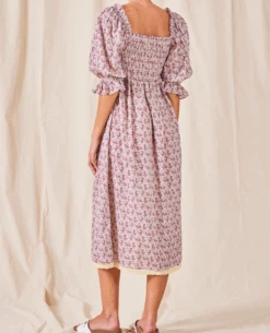 Mabe Derby Print Shirred Multicolor Midi Dress, a soft cotton printed dress with floral print. The silhouette features a shirred elastic at the bodice and a floaty skirt. With 3/4 length voluminous sleeves, the Derby dress features squared neckline.
