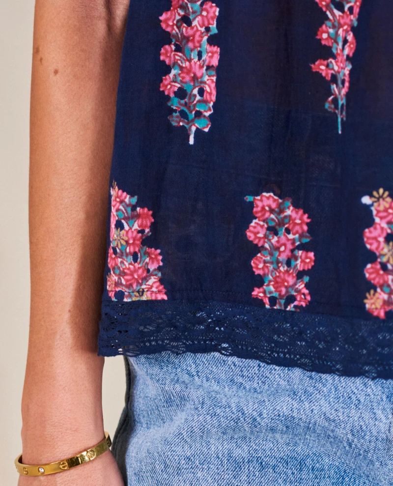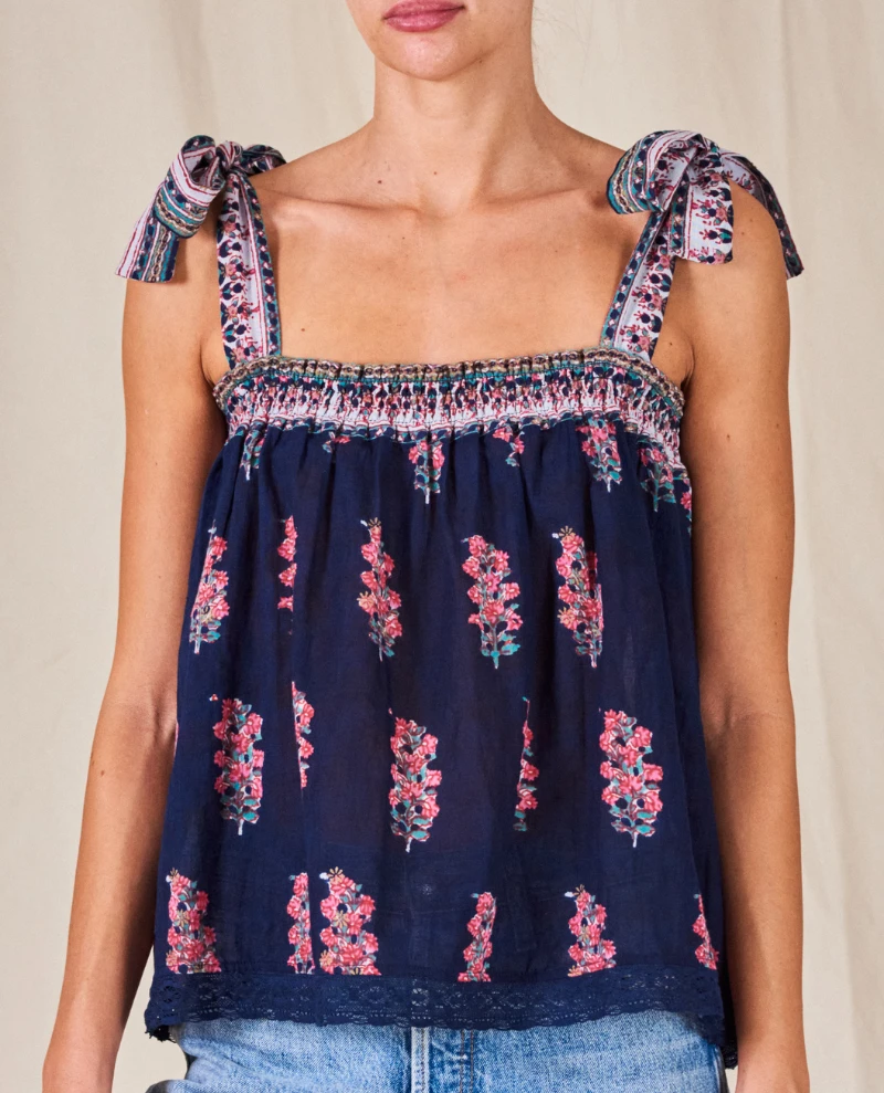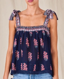 Mabe Flori Print Indigo Top, a floaty strap top with repeat print. With a deep indigo base, the Flori top ties at the shoulders for a comfortable yet feminine look and is complete with square neckline.
