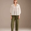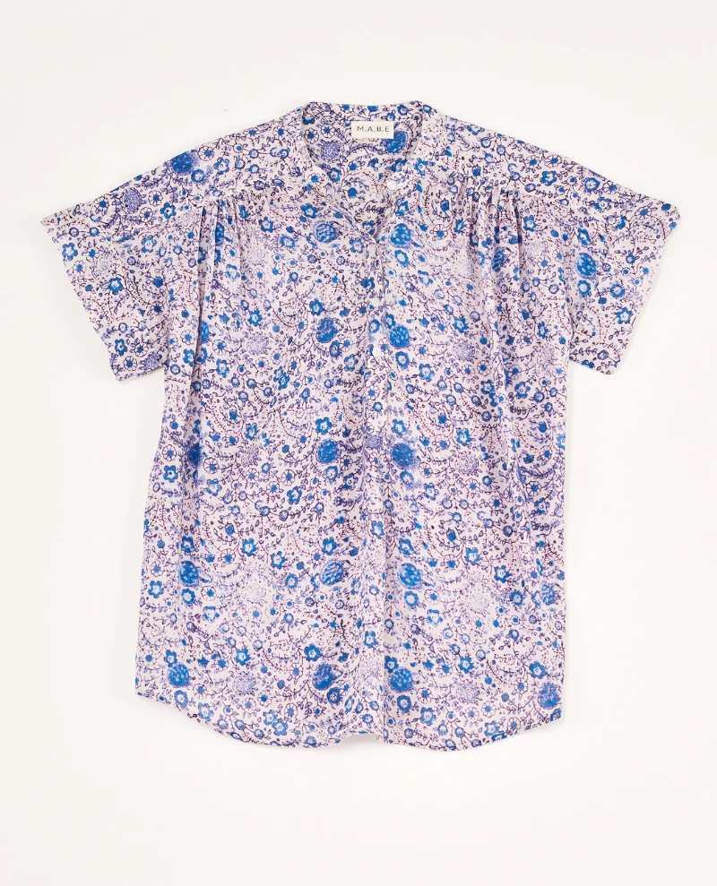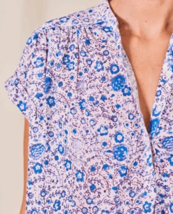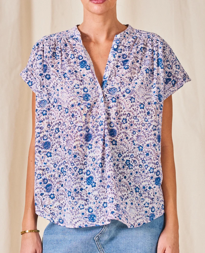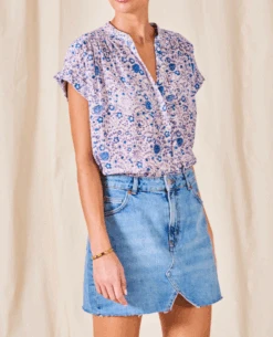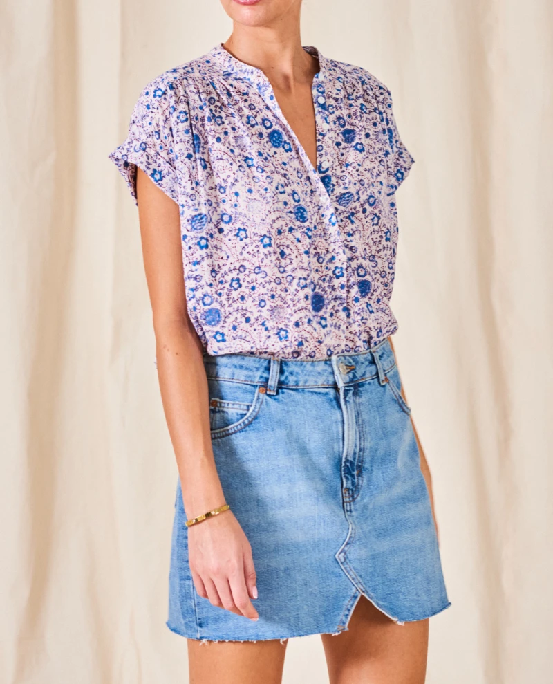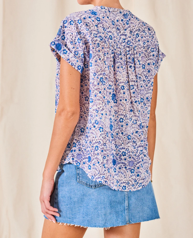 Mabe Joss Print Multicolor Top, a lightweight short sleeved blouse. The Joss has wide, short sleeves and a rounded neckline with v-neck opening to the front. With a relaxed fit, the blouse is complete with fine blue floral print.