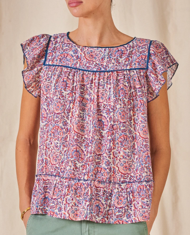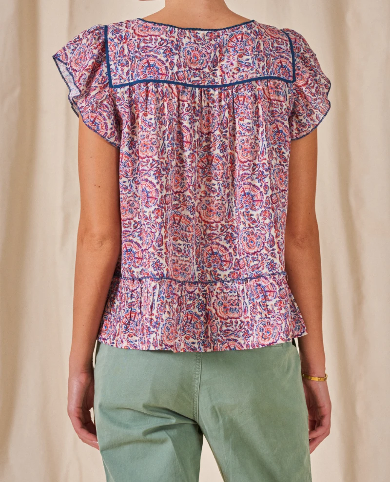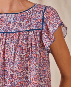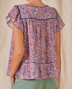 Mabe Maya Print Multicolor Top, a short sleeves blouse with romantic and feminine appeal. Complete with simple, rounded neckline and navy pipe detailing, the Maya has short, floaty sleeves and a dropped waistline for a relaxed look. Complete in pink fine floral print.