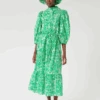 Mabe Ria Print Red Midi Dress, a stunning midi style shirt dress in vibrant red. With delicate frill and lace detailing, the Ria dress has loose, long sleeves and a high collar. With a slightly nipped in waist and v-neckline to the front, it is both fun and flattering.
