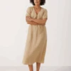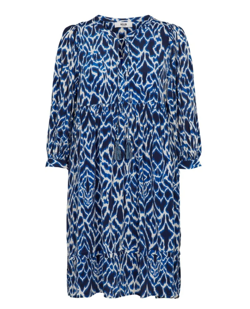 Moliin Jolene Lapis Blue Mini Dress, a smock style printed dress with bold blue print. The Jolene dress has a loose silhouette with long sleeves and rounded neckline, complete with tassel tie detail.