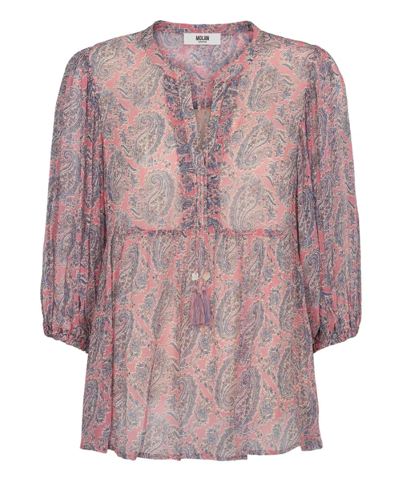 Moliin Paxton Pink Limonade Blouse, a loose, printed blouse in pink with repeat paisley pattern. The Paxton blouse has 3/4 length sleeves and rounded neckline with tassel tie detail.