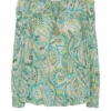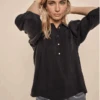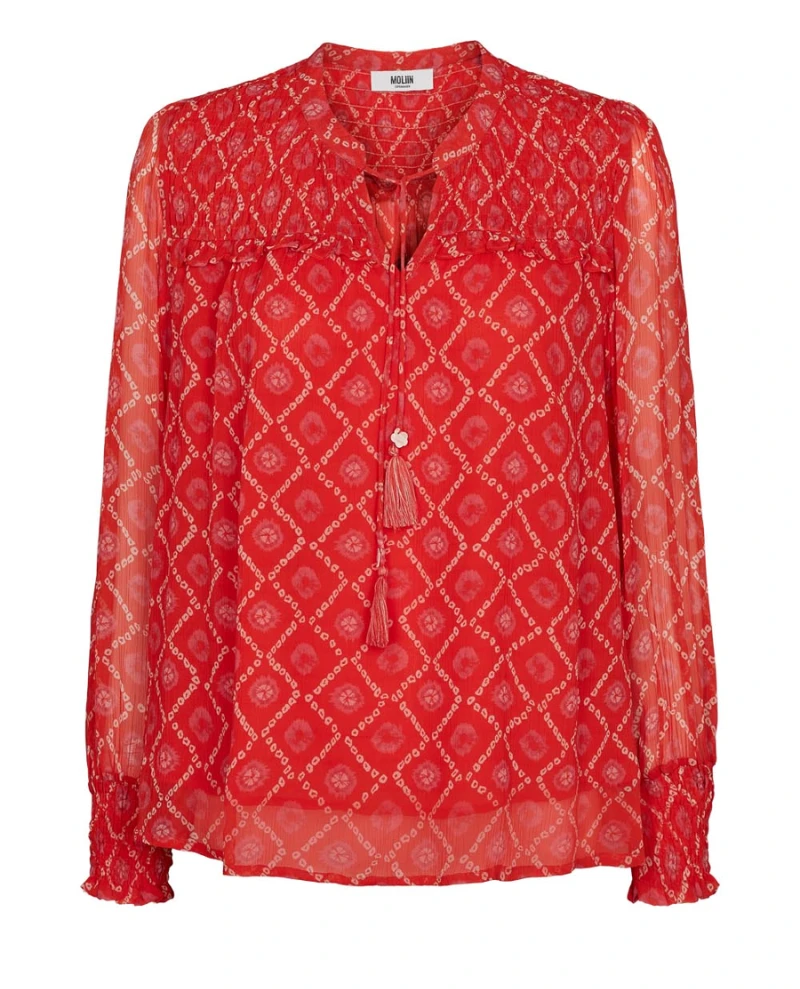 Moliin Rae Poinciana Blouse, a vibrant rich red blouse with round neckline and tiny slit with tasseld strings attached. Smocked font, this floaty blouse is finished with long sleeves and long, ruched cuffs.