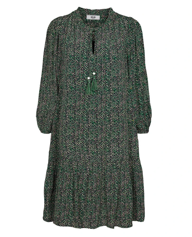 This Moliin Ria Green Dress is a sophisticated choice for any occasion. Crafted with a luxurious blend of green and black fabric, its long sleeves and tassel detail to neckline give it an exquisite look. Perfect for the office or a formal evening out.