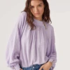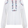 Moliin Roxanne Evening Blue Blouse, a light floral blouse in rich red tones. Made from viscose, this blouse has a pleated collar attached around the chest, voluminous sleeves and ruffles to the elbow and cuff.