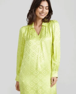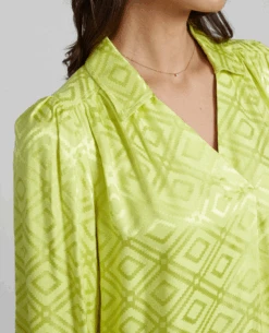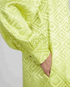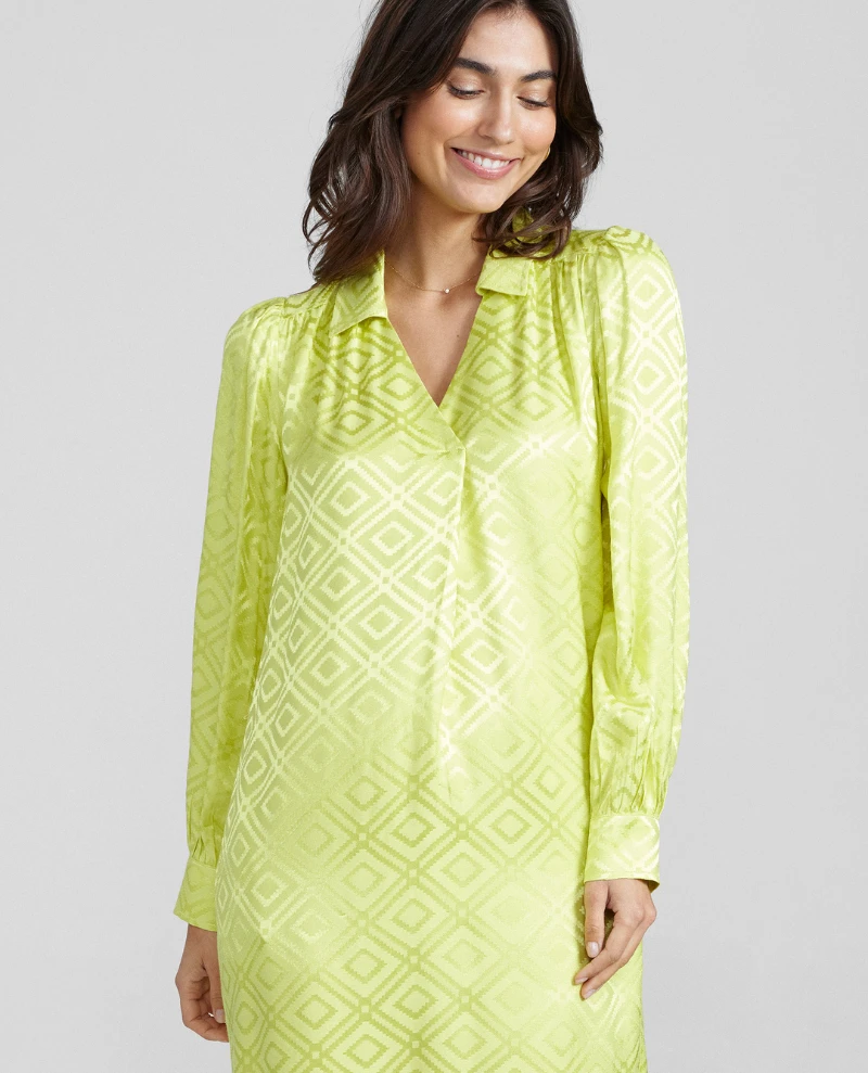 Mos Mosh Aldo Geo Yellow Plum Dress, a vibrant jacquard dress with a timeless silhouette. Itβs designed in a slightly loose silhouette with long balloon sleeves, a curved hem, and soft pleat details at the front and the back. Style with sandals or boots for a cool and more casual look or heels for the perfect summer wedding or event look.