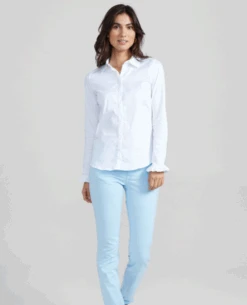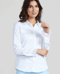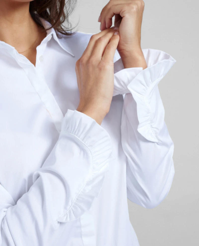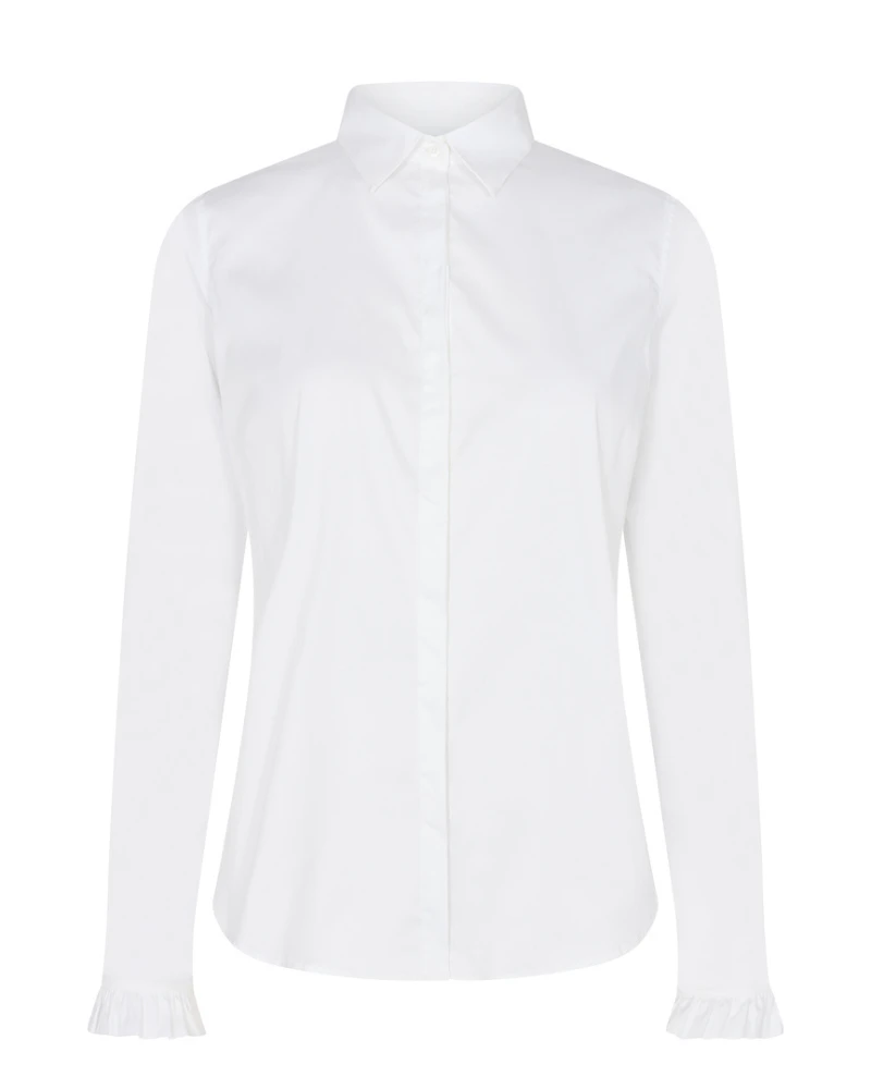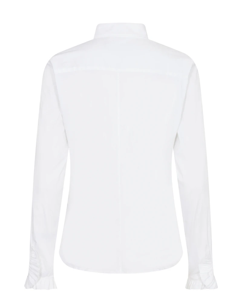 Stay on trend with the Mos Mosh Mattie White Shirt. This classic crisp white shirt has a button down front while details like the collar and fluted frill cuff offer a feminine touch. Dress up your everyday look with this timeless piece.