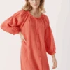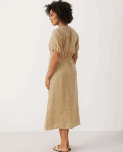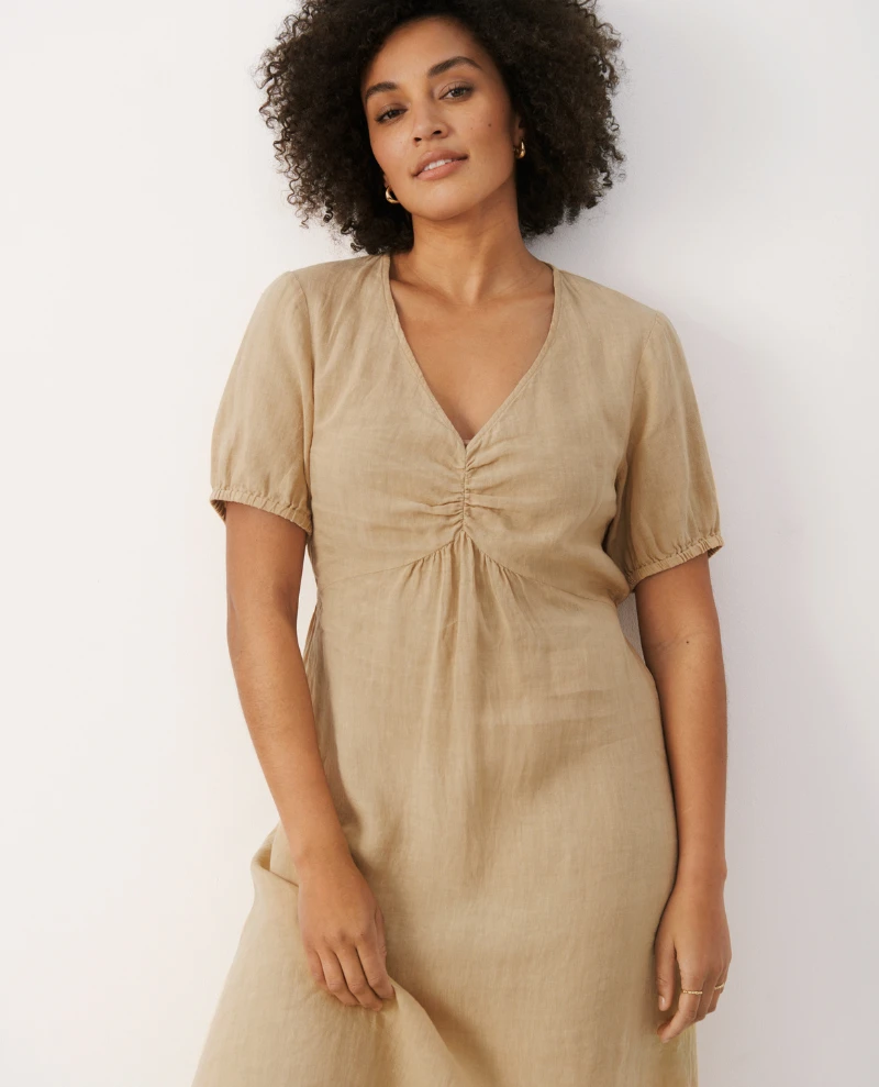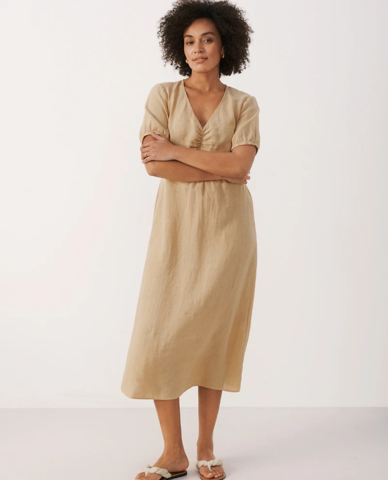 Part Two Althea Warm Sand Dress, a neutral sand toned linen dress. The Althea is an easy fitting sundress, with short sleeves and v-neckline. With shaping to the bust for a flattering fit.