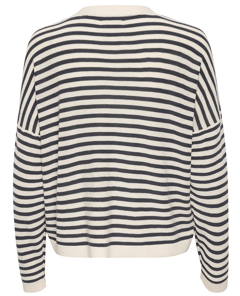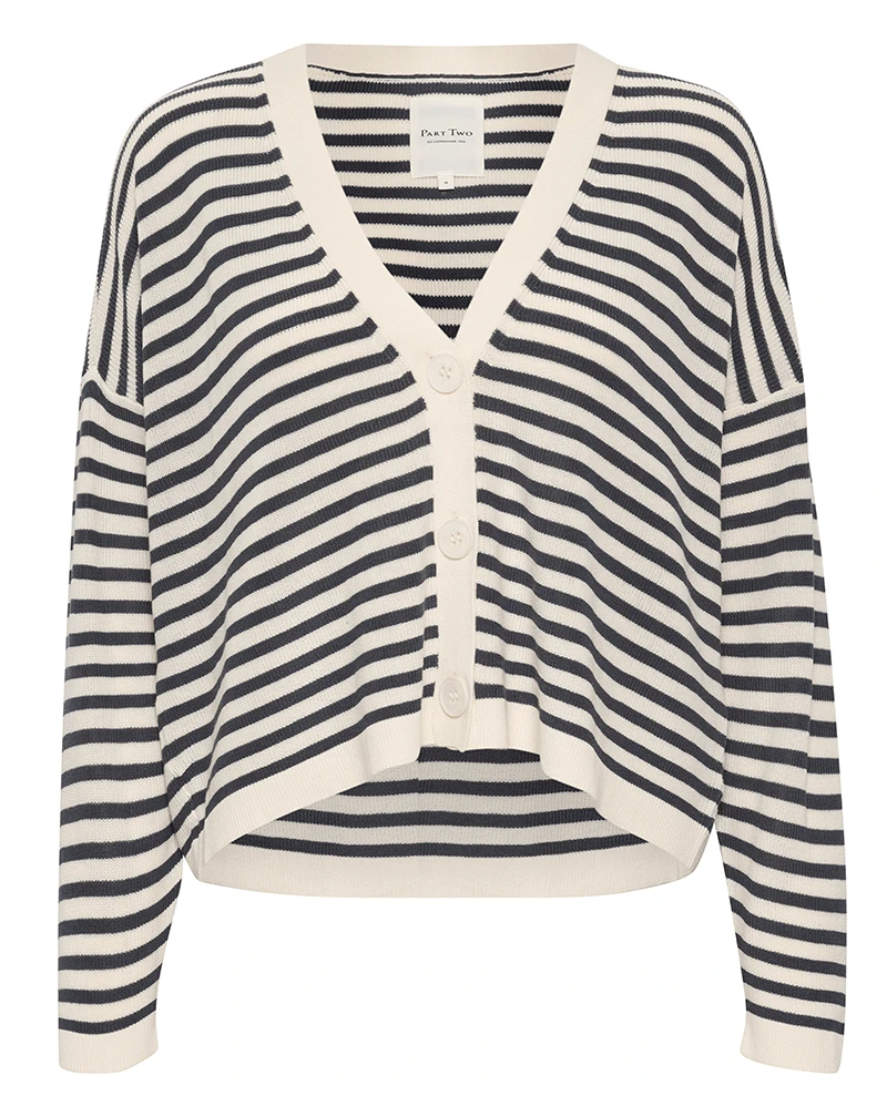 Part Two Bessie Navy Stripe Cardigan, a loose and slouchy navy and cream striped cardigan with a deep v neck and dropped shoulders. Casual yet chic, the Bessie stripy button down knit has long sleeves and an oversized fit.Â