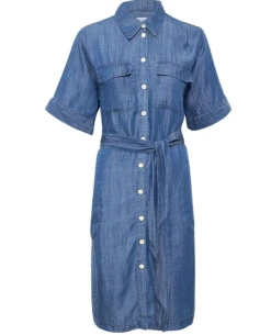 Part Two Brielle Blue Dress, a casual blue chambray denim shirt dress with a pointed collar and short loose sleeves. Tying at the waist with a removable tonal blue waist belt the Brielle dress has a row of white buttons running down the front and patch pockets on the chest.Â