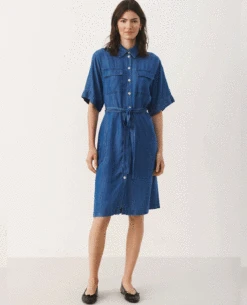 Part Two Brielle Blue Dress, a casual blue chambray denim shirt dress with a pointed collar and short loose sleeves. Tying at the waist with a removable tonal blue waist belt the Brielle dress has a row of white buttons running down the front and patch pockets on the chest.Â