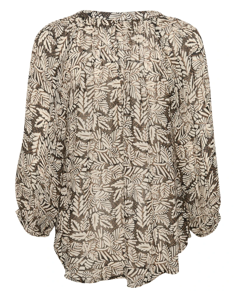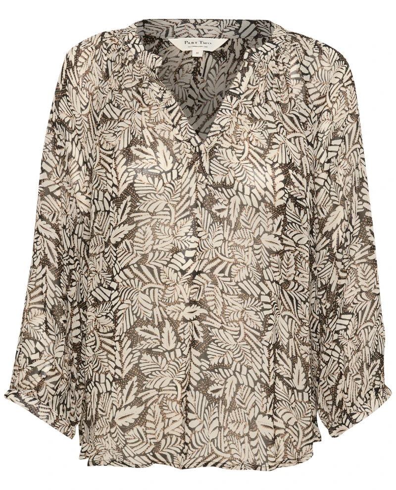 This Part Two Erdonae black blouse offers an elevated look with a monochrome print and subtle floaty design. It features 3/4 length sleeves and a v-neckline for a more formal, refined silhouette. Create a fashion-forward look that transitions easily from day to night.