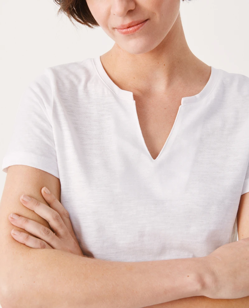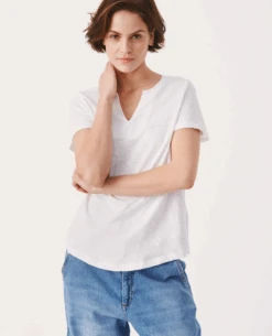 Part Two Gesinas Bright White T-Shirt, a relaxed white cotton t-shirt with short sleeves and small v-neck to the front. Pair with your favourite denim year round.