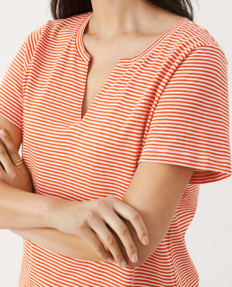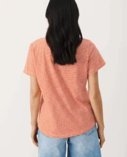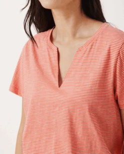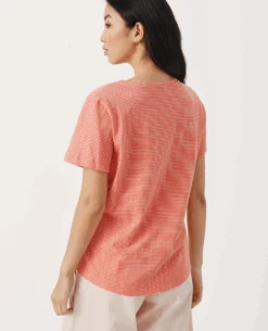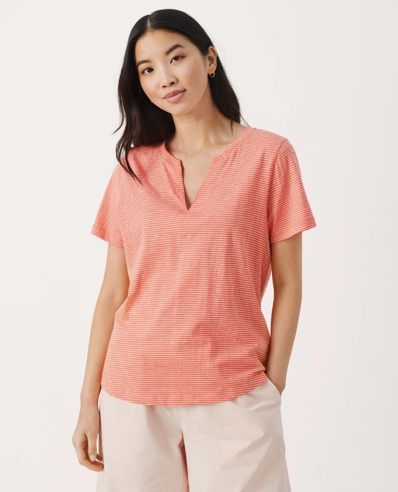 Part Two Gesinas Porcelain Rose T-Shirt, a relaxed white cotton and rose stripe t-shirt with short sleeves and small v-neck to the front. Pair with your favourite denim year round.