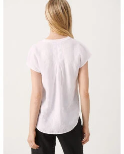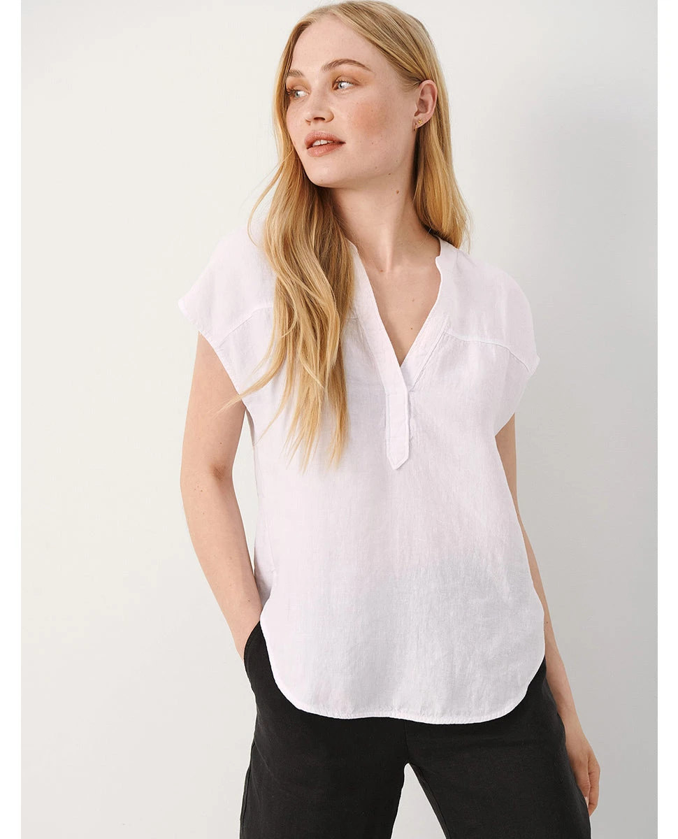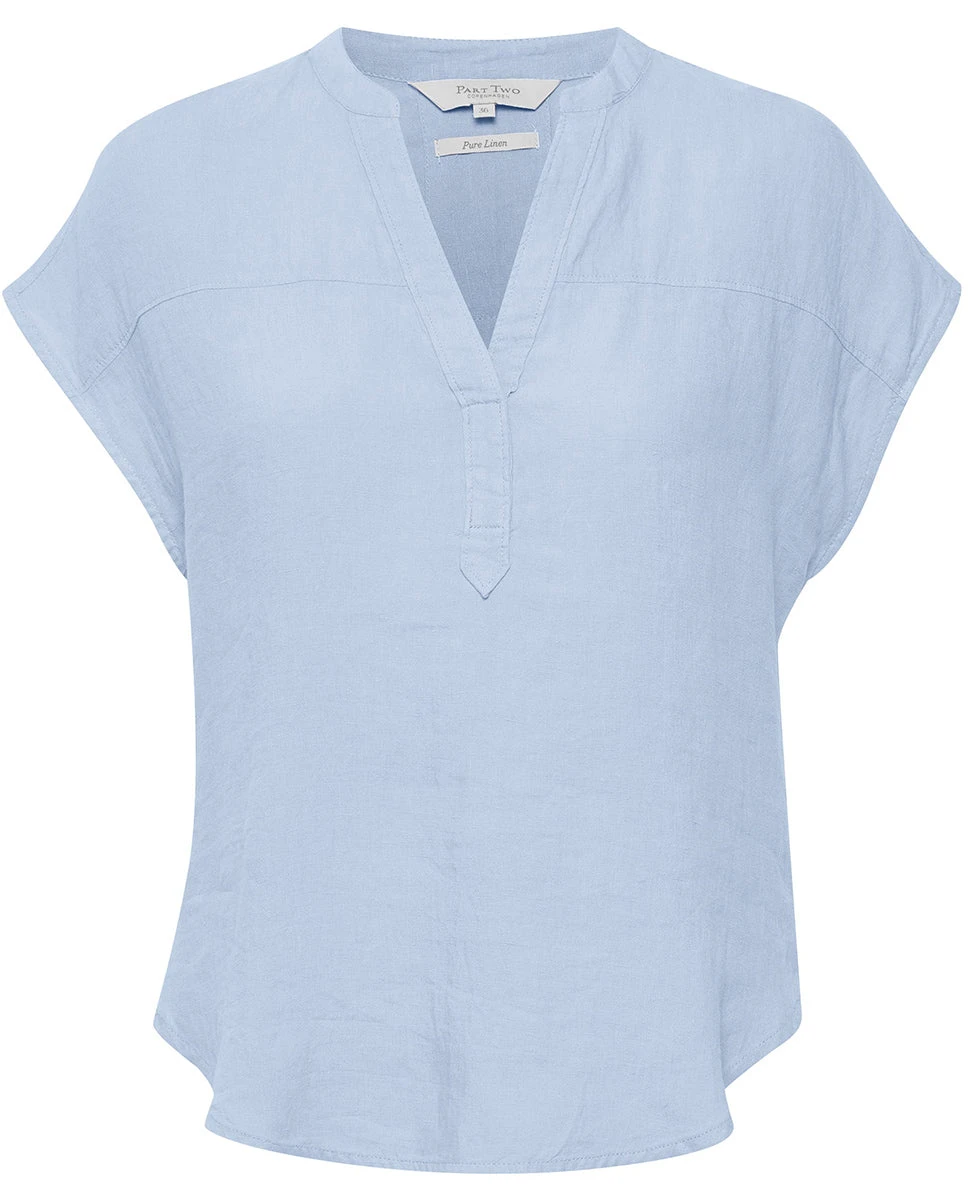 Part Two Ieva Blue Shirt, a light blue loose fitting linen top for Summer with short capped sleeves and a v neck. Lightweight and breathable this pale blue pullover blouse has a rounded hemline and also comes in white.Â