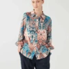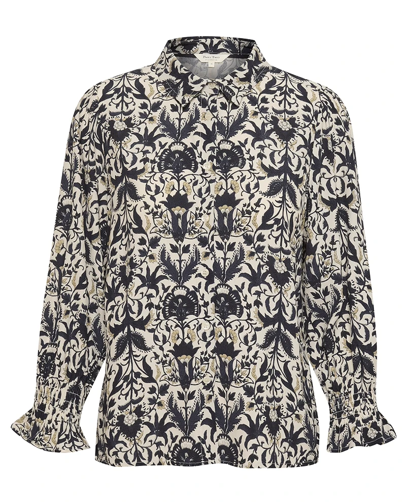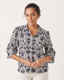 Part Two Nevin Navy Block Print Shirt, a navy blue block printed button down shirt with puffed 3/4 length sleeves and a pointed collar.Â