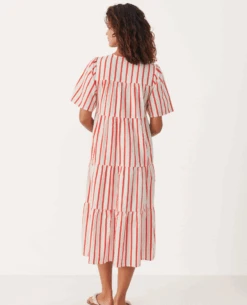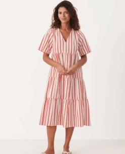 Part Two Pam Grenadine Dress, a tiered stripe sundress with short sleeves and a v neck. Loose and floaty this textured seersucker midi dress falls to mid calf in length. Also available in white and a stripe as pictured on the model, the Pam dress will become your go to for sunny days at home and on holiday.Ā