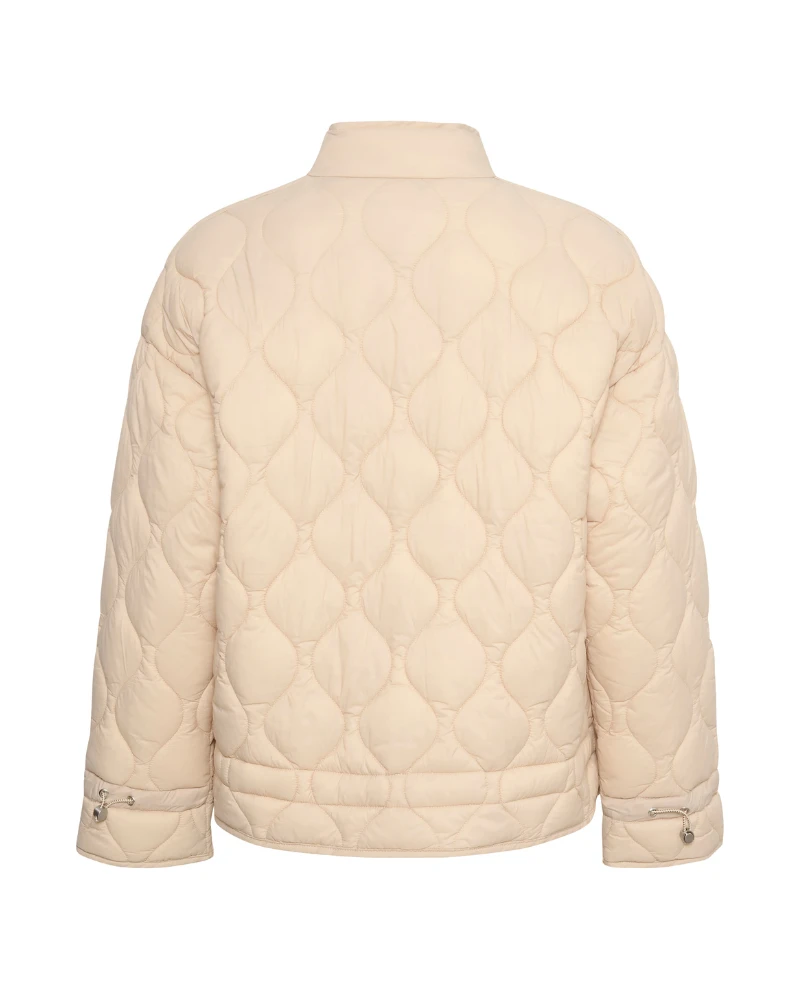 Part Two Saira Oatmeal Jacket, a pale cream quilted jacket. With small funnel neck and pocket detail to the front, the Saira jacket has long sleeves, drawstring to hem and popper style closure to centre and cuffs. Available in two colours.