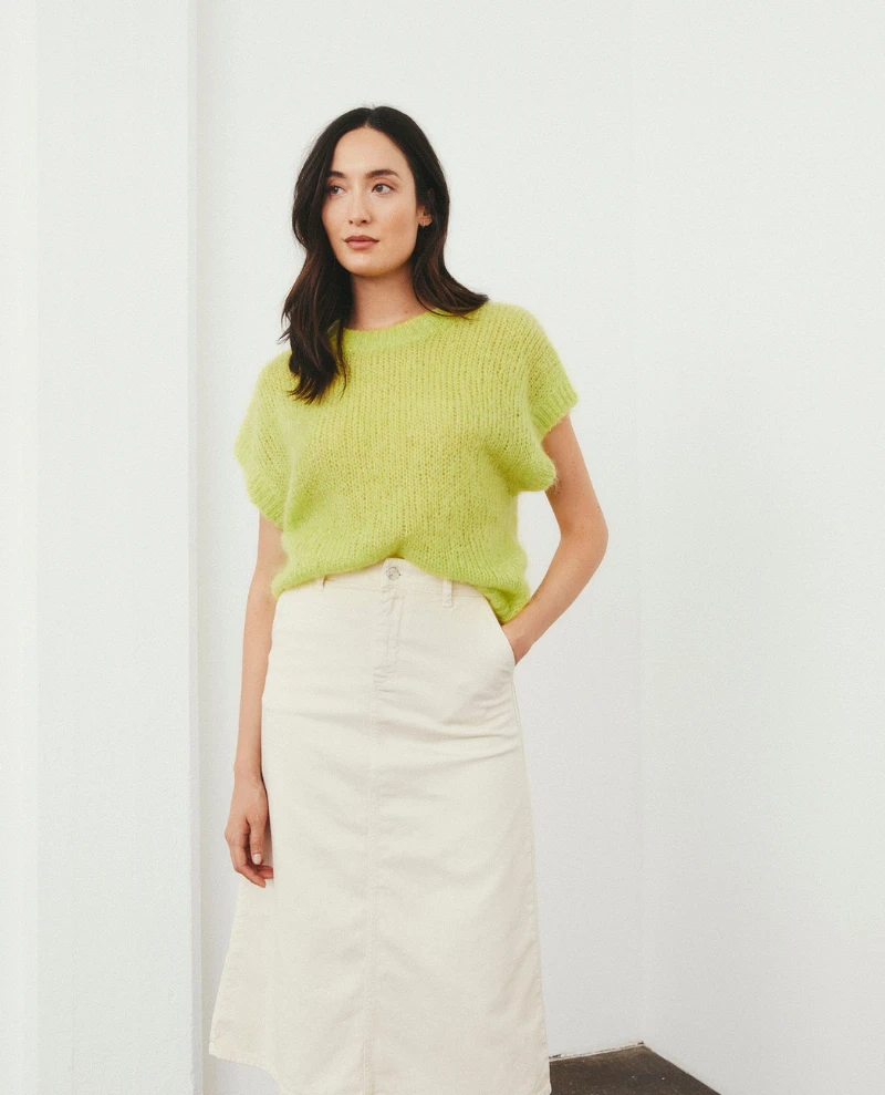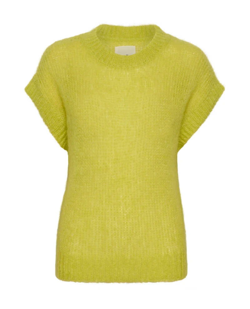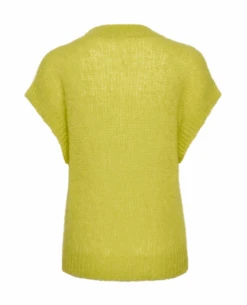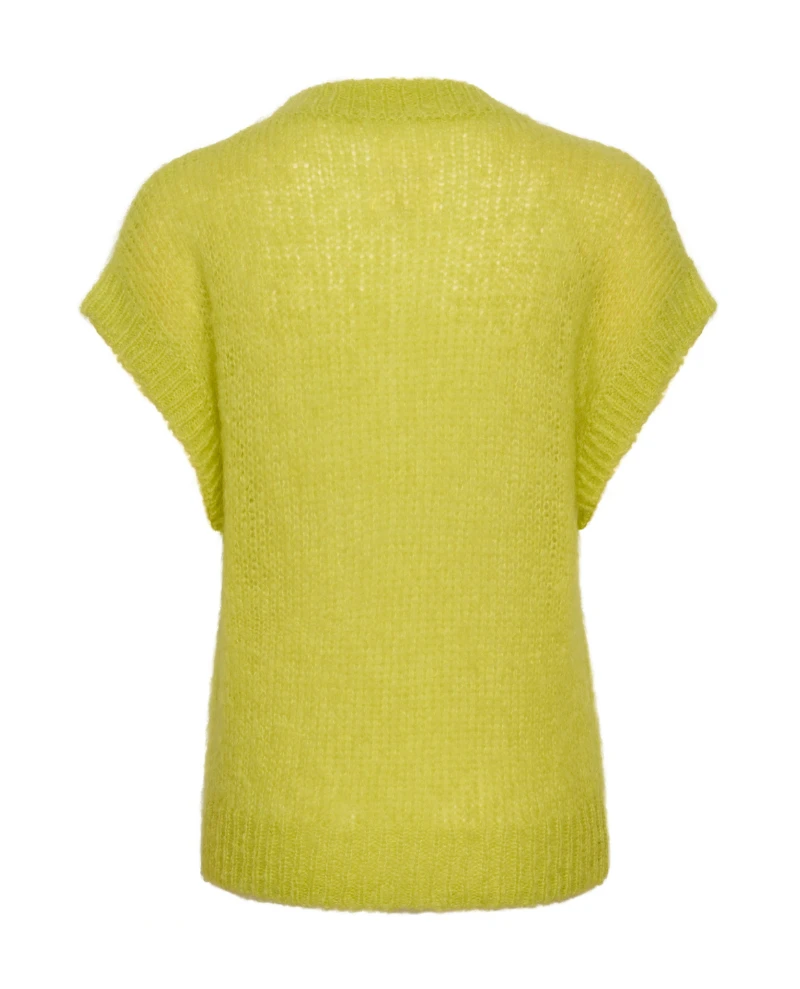 Part Two Siara Daiquiri Green Vest, a knitted short sleeve jumper with rounded neckline. In a bright yellow/green, wear alone or layered over shirts and long sleeved tops.