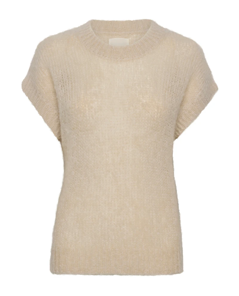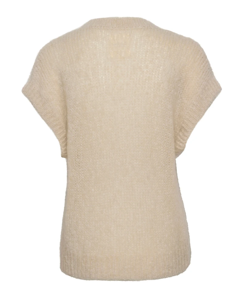 Part Two Siara Whitecap Grey Vest, a pale beige knitted vest with rounded ribbed neckline and short sleeves. Perfect for layering, this is a warm knit.