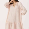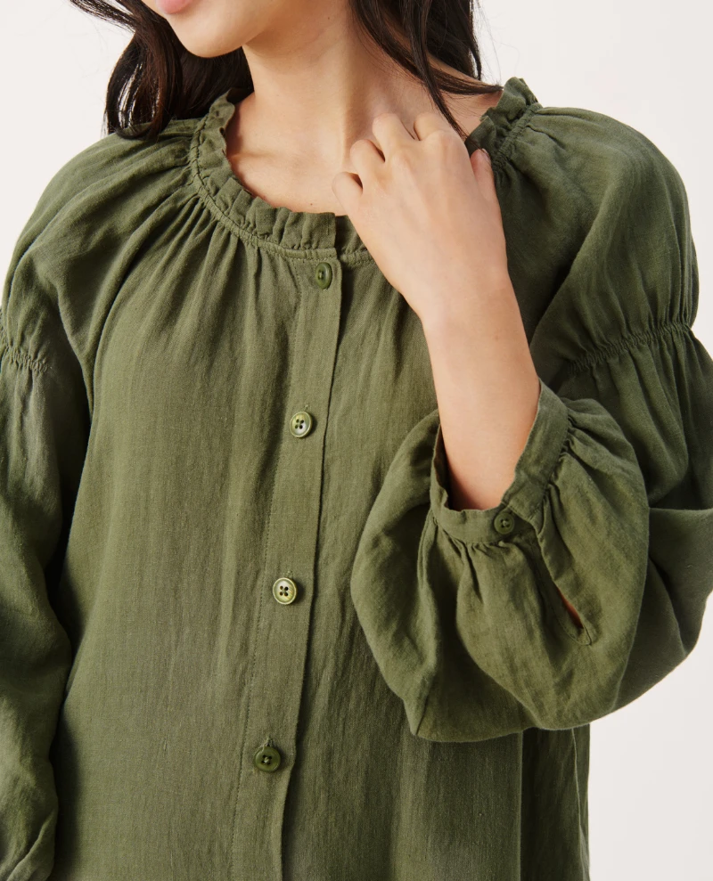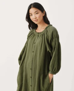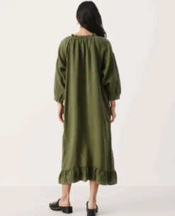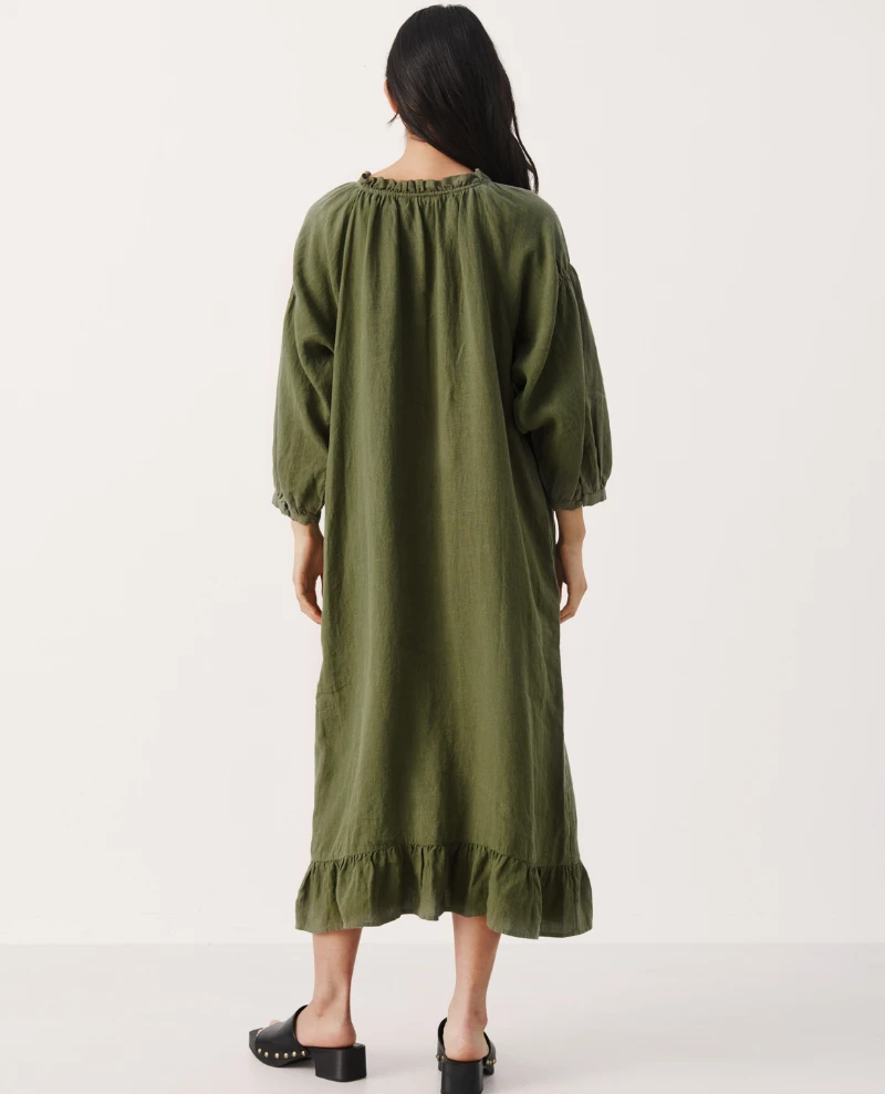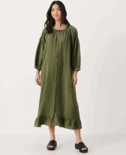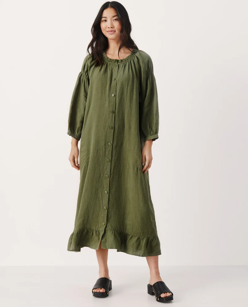 Part Two Sisse Kalamata Dress, a deep olive green linen dress. With button down finish, the Sisse is available in two tones, with long voluminous sleeves and frill detail to neck and hem.
