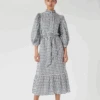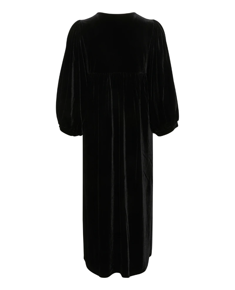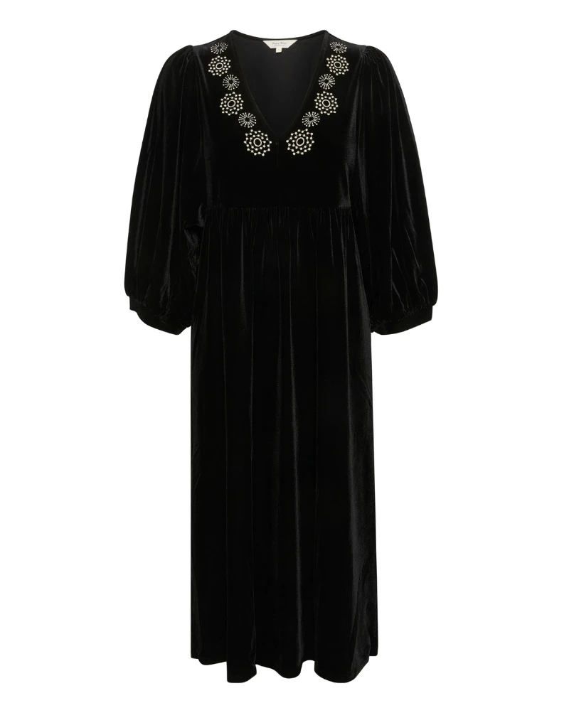 Part Two Thalea Black Embroidered Dress, a velvety dress with billowing sleeves. Complete with a v-neckline, the Thalea is finished with white embroidery to the neckline.