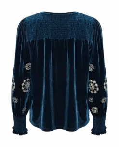 Part Two Tian Velvet Moonlit Ocean Blouse, a deep blue long sleeve blouse in a velvety finish. With a crew-neckline and long sleeves, the Tian blouse has elasticated cuff and neckline and is finished with intricate white embroidery on the sleeves.