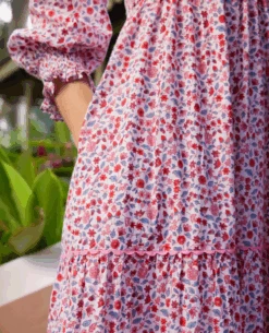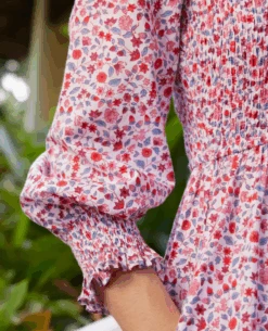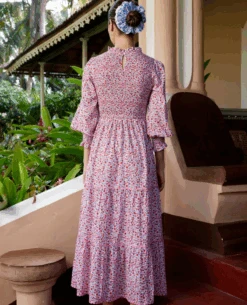 Pink City Prints Isabel Scarlet Forest High Neck Dress, the best selling Isabel dress in vintage pink tones. Complete in a comfortable, smocked body and chic, ruffled high neck, the Isabel dress is designed to be worn again and again. A versatile shape that can be dressed up or down for every day. Block printed by hand, it is complete with side seam pockets and a pretty, ricrac trimmed skirt. Unlined