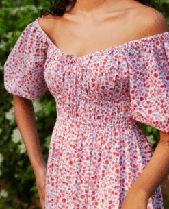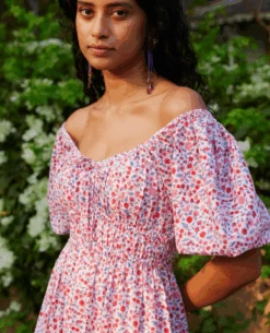 Pink City Prints Sweetheart Scarlet Forest Rah Rah Dress, a flattering, block printed dress with an open neckline and rows of elastic under the bust. The Sweetheart Rah Rah is a versatile addition to your wardrobe. Dress up or down, it features a statement, gathered sleeve, pretty bow at the neck and gathered, tiered skirt. Block-printed by hand in shades of pink, red and blue. Finished with side seam pockets.