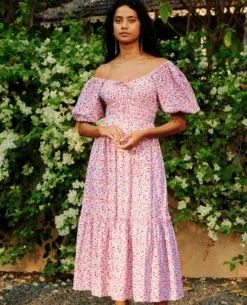 Pink City Prints Sweetheart Scarlet Forest Rah Rah Dress, a flattering, block printed dress with an open neckline and rows of elastic under the bust. The Sweetheart Rah Rah is a versatile addition to your wardrobe. Dress up or down, it features a statement, gathered sleeve, pretty bow at the neck and gathered, tiered skirt. Block-printed by hand in shades of pink, red and blue. Finished with side seam pockets.
