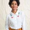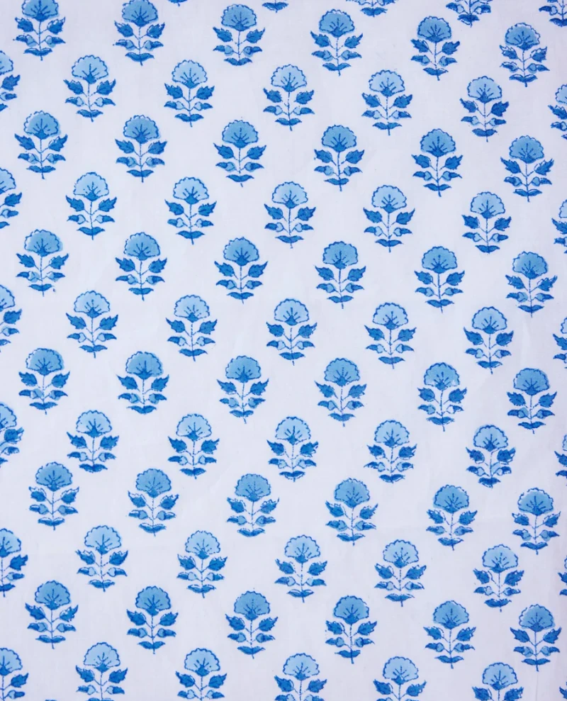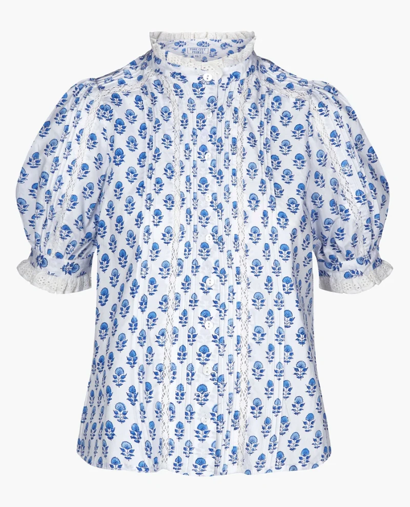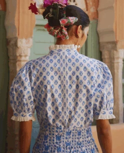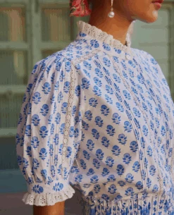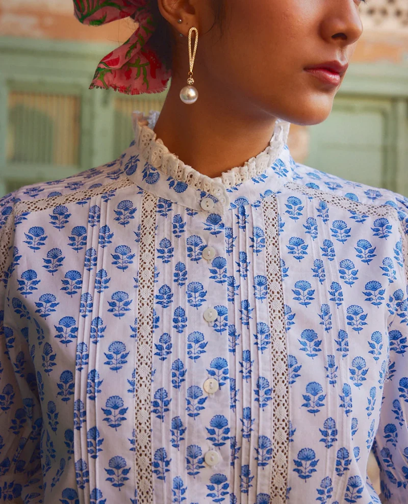 Pink City Prints Vera Sky Buta Blouse, inspired by vintage blouses, the Vera is a wardrobe classic finished with pretty rows of pin-tucks and lace inserts. Block-printed by hand in delicate blue butas onto rich organic poplin. Finished with pretty lace ruffles at the sleeve and collar. Unlined. Relaxed fit.