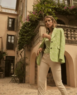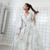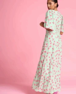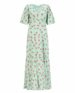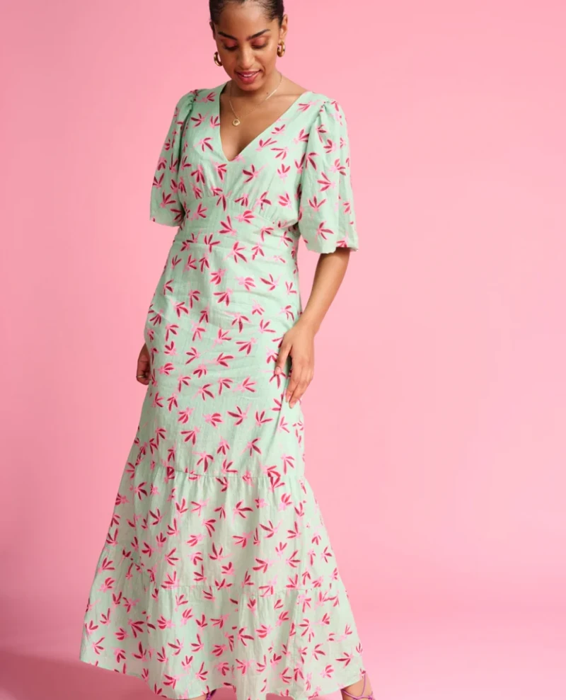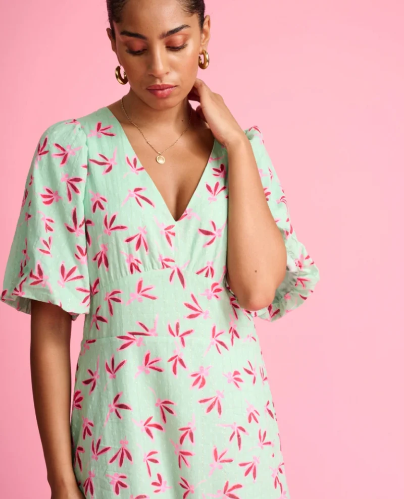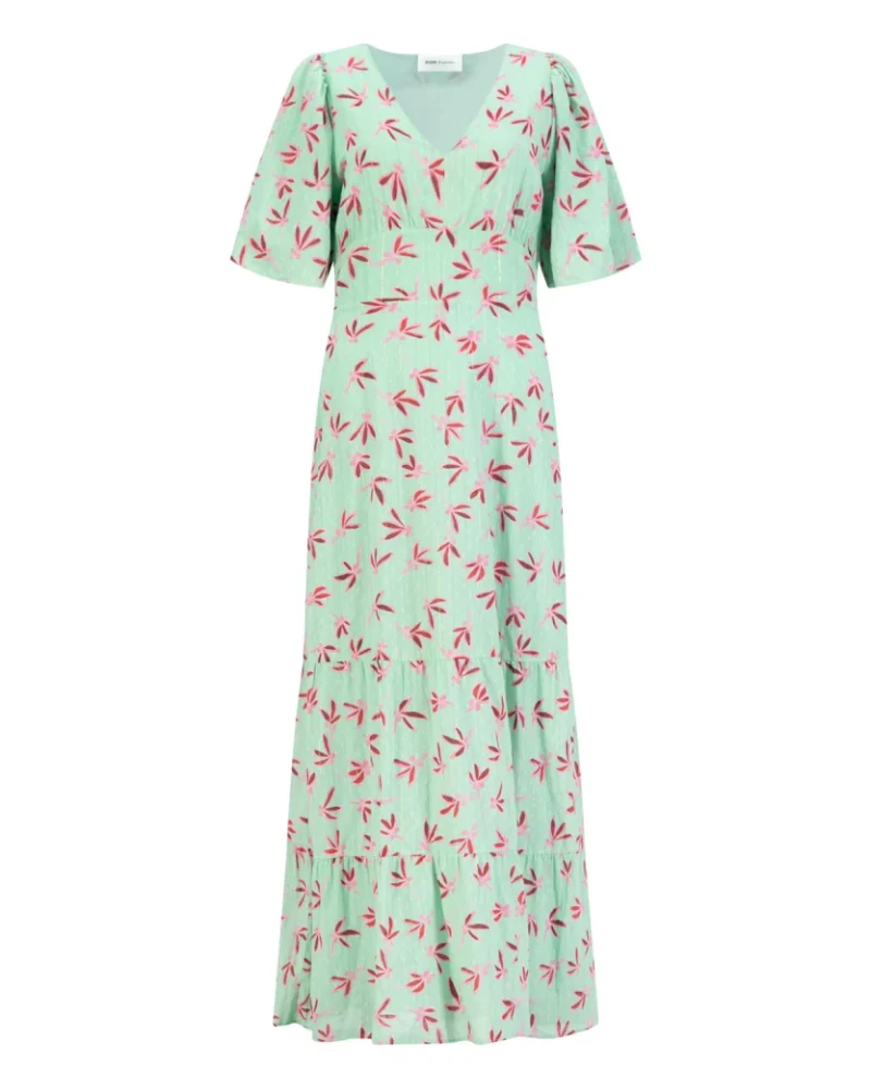 Pom Amsterdam Charley Fly Away Green Dress, a mint green dress featuring a hand-painted red and pink fly-away print. The skirt is lined and has flounces at the bottom while the fabric contains a gold lurex thread and features a subtle pattern with dots. The dress is fitted and smocked on the back of the waistband.Â