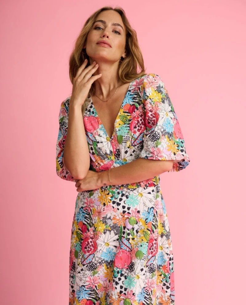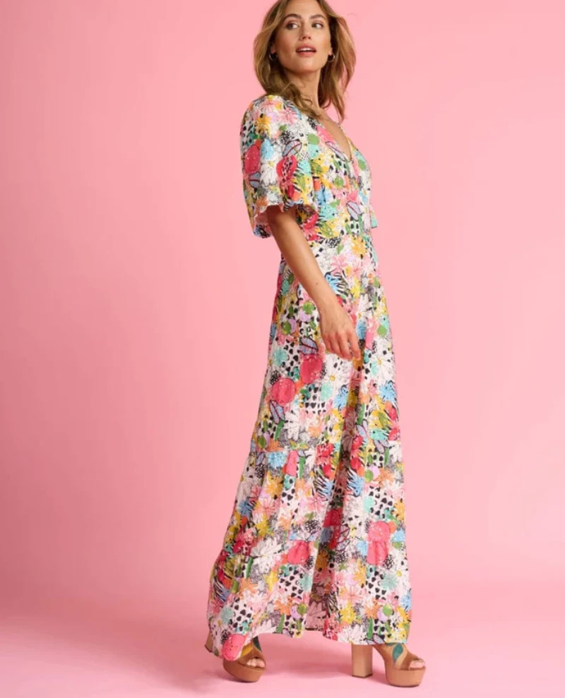 Pom Amsterdam Charley Tropical Bouquet Dress, a tropical floral maxi dress with openwork floral texture. With a slight flare to the skirt, the Charley dress has voluminous sleeves and a v-neck. Fully lined.