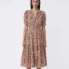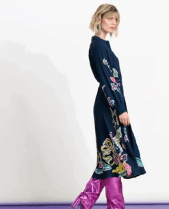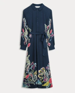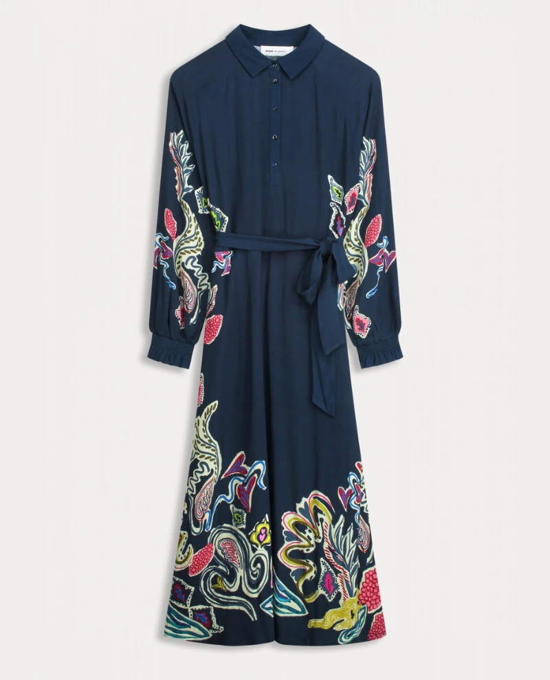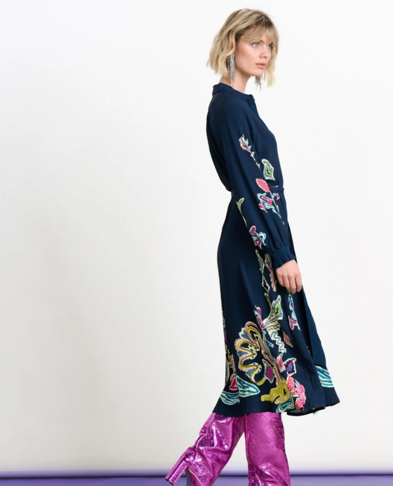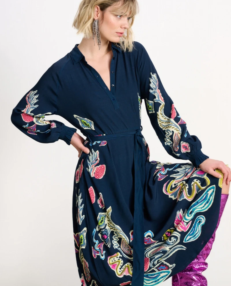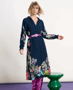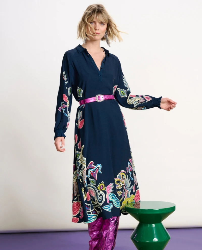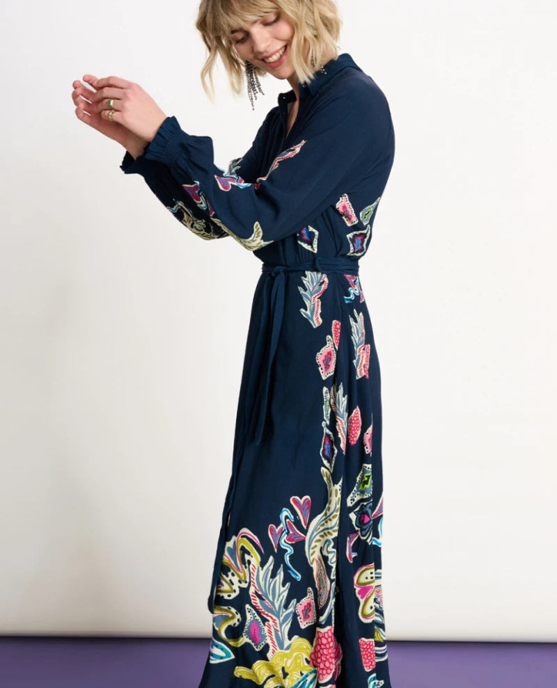 Make a stylish statement with the Pom Amsterdam Full Glow Maxi Blue Dress. This dress features a flattering silhouette with its long sleeves, waistband, and collar details. The colorful floral print adds a touch of charm. Feel beautiful and confident in this timeless piece.
