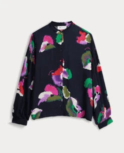 Turn heads in the classy Pom Amsterdam Violets Blue Blouse. Crafted from quality fabric, this fluid blouse features a deep navy hue and a vibrant violet print. Its long voluminous sleeves and button down front add a timeless touch of sophistication. Perfect for any occasion.