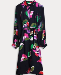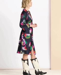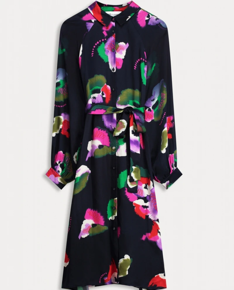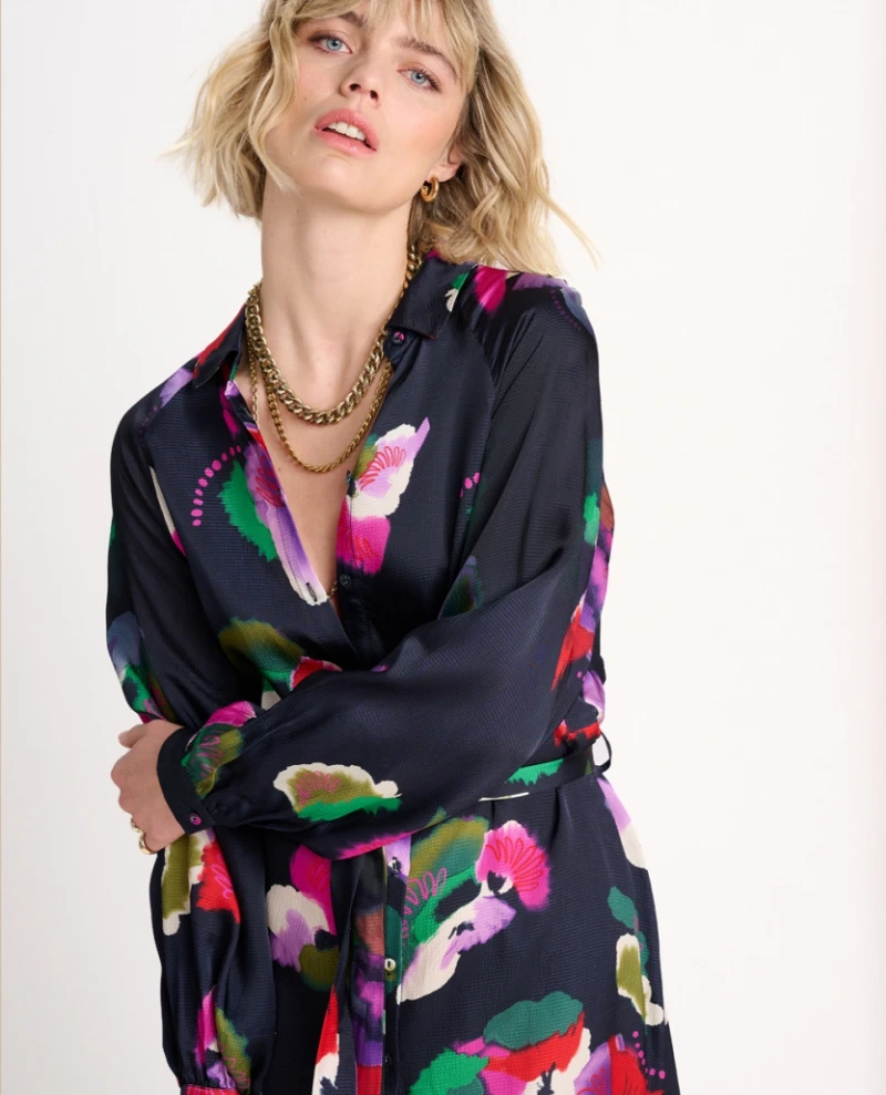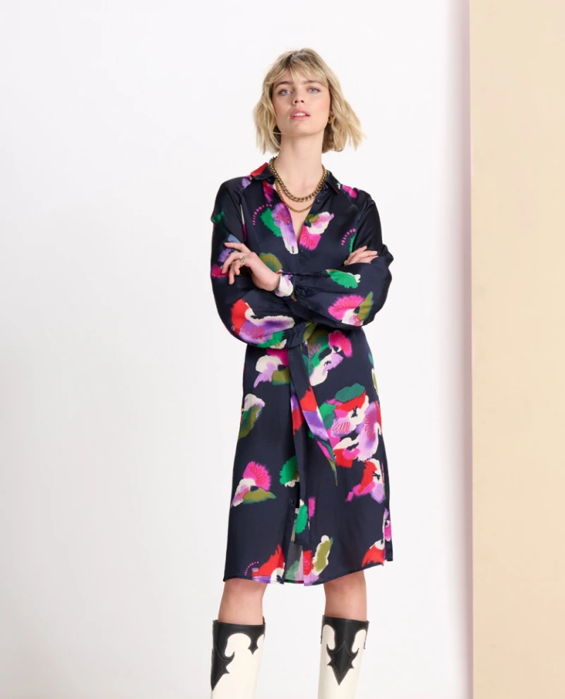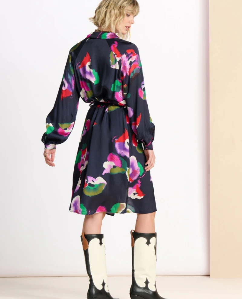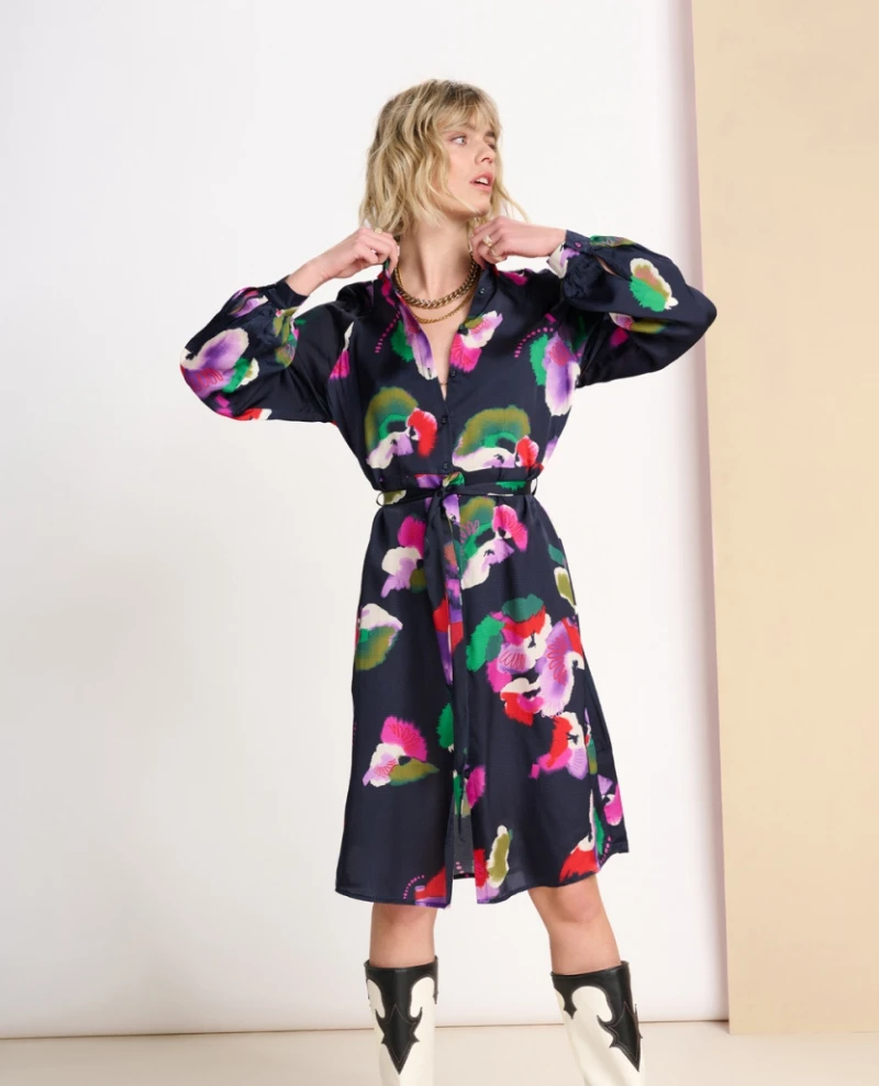 The Pom Amsterdam Violets Blue Dress is perfect for stylish occasions. Crafted from lightweight and fluid fabric, this navy printed shirt dress features a vibrant violet print that is sure to make a statement. It falls to the knees with long sleeves and can be dressed up or down depending on the occasion.