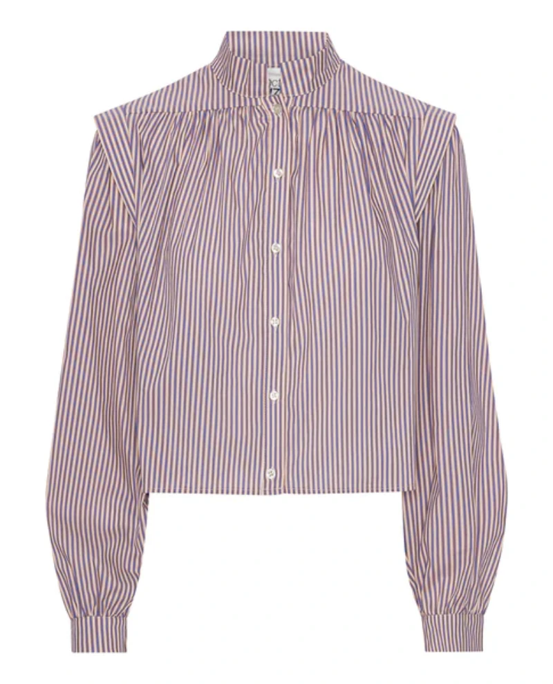Meet MARINA, an ultra-stylish blouse crafted from a comfortable blend of fabrics. Boasting a strong silhouette with a high collar and pleat shoulder detail, the MArina blouse is sure to be an edgy addition to any wardrobe.