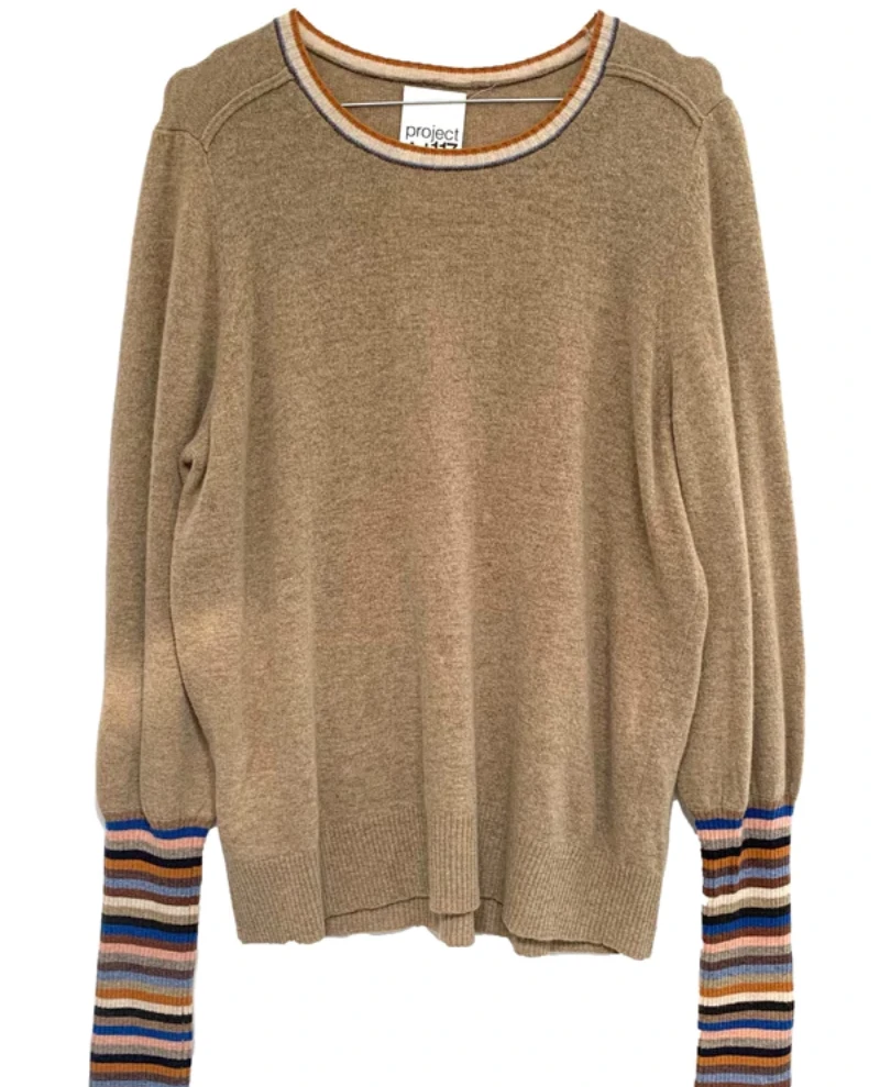 Stay fashionable and eco-friendly with the Project AJ117 Sigga Khaki Knit. Crafted with soft wool and nylon recycled from fishing nets, this stylish pullover features a round neck and long sleeves with 12 color stripes. Its extra fine RWS merino wool ensures comfort and sustainability.