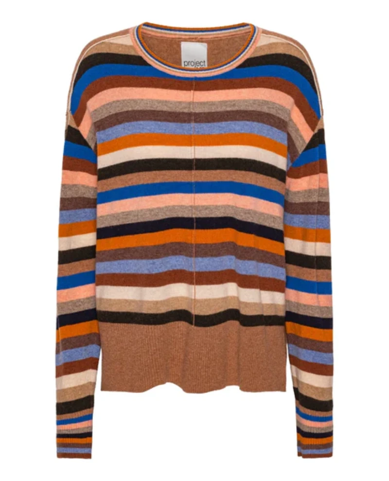 The Project AJ117 Stacey Stripe Knit is a stylish pullover with a round neck and long sleeves. Knitted from a blend of extra fine RWS merino wool and recycled nylon fishing nets, this garment is soft and comfortable while promoting sustainability. It also features side slits and a slightly shorter length in the front. Wear this knit and help create a cleaner ocean!