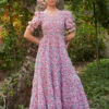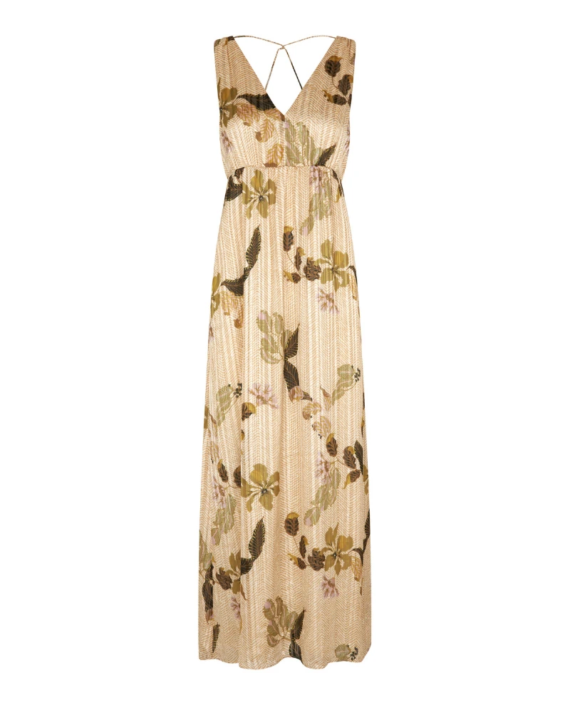 Second Female Breeza Dark Chalk Maxi Dress, a long length maxi dress. With deep v-neckline and tie detail to the nape of the neck, the Breeza has a flowing pleated skirt in neutral tone with floral pattern.